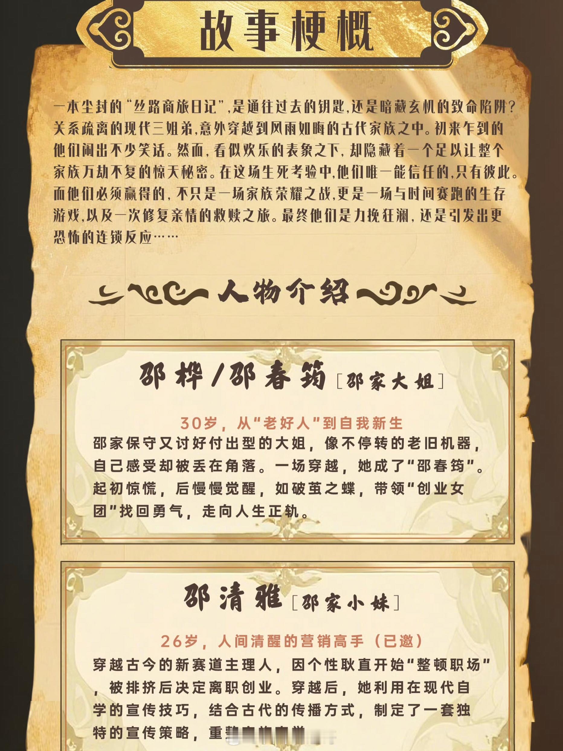 🥭《花儿与少年》首部衍生短剧选角故事梗概:一本尘封的“丝路商旅日记”,是通往过去的钥匙,还是暗藏去机的致命陷阱?关系疏离的现代三姐弟,意外穿越到风雨如再的古代家族之中。初来乍到的他们闹出不少笑话。然面,看似欢乐的表象之下,却隐藏着一个足以让整个家族万劫不复的惊天格密。在这场生死考验中,他们唯一能信任的,只有彼此而他们必须赢得的,不只是一场家族荣耀之战,更是一场与时间赛跑的生在游戏,以及一次修复亲情的救财之旅。最终他们是力挽狂澜,还是引发出更恐怖的连锁反应··…