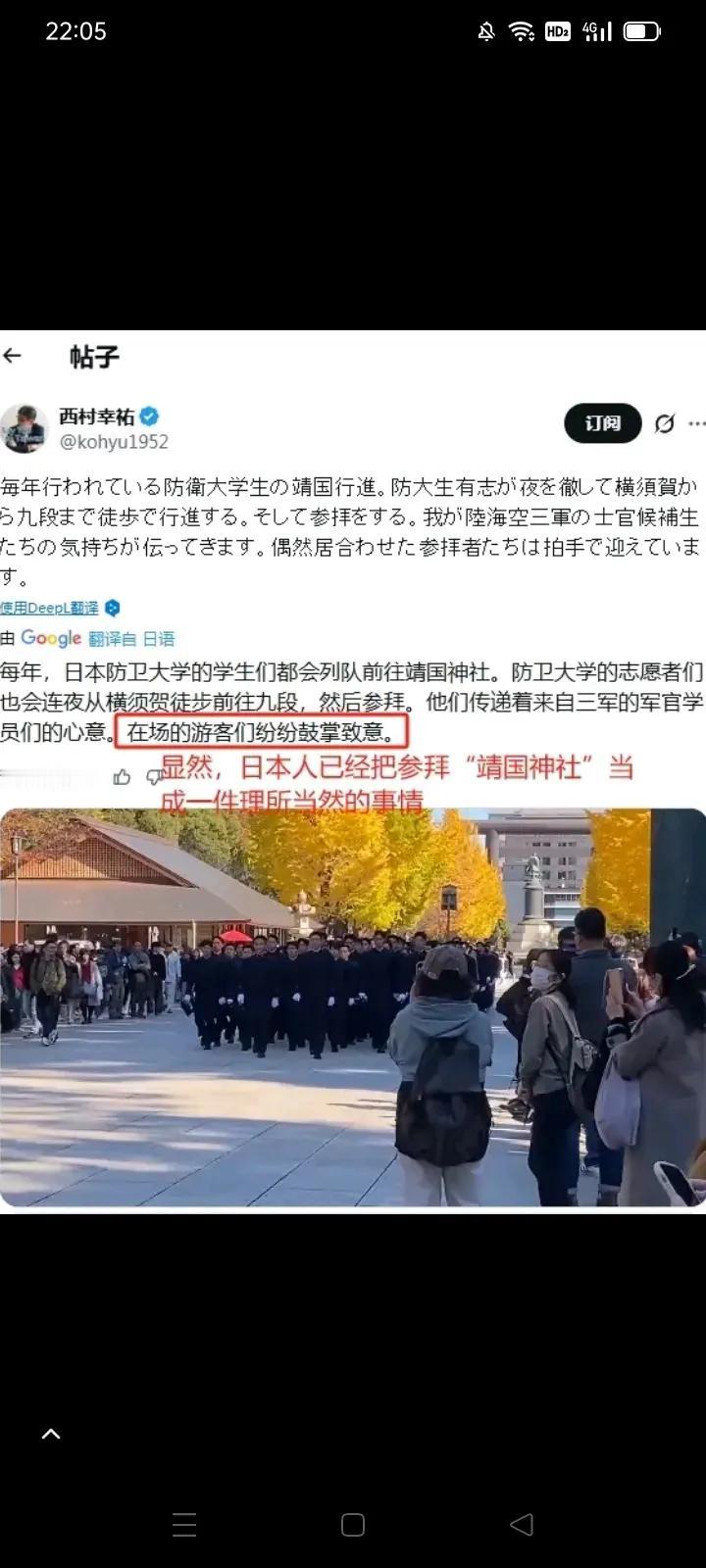 中国公祭侵华日军南京大屠杀遇难同胞在即 日本防卫大学数百学员集体参拜烬倭鬼厕 *12月13日是中国的侵华日军南京大屠杀遇难同胞国家公祭日。 88年过去了,日本政府一直拒绝承认它们国家对中国犯下的罄竹难书的战争罪行!它们审定的教科书更是反咬一口,污蔑中国挑起战争! 昨天,日本防卫省直属防卫大学的数百学员徒步十多个小时,从军事基地横须贺赶往东京的烬倭鬼厕进行崇拜。据说这是它们每年坚持的惯例。 这批军校生,大多数会直接成为日本军队的军官。 *我的看法是:1崇拜对外侵略战争的军国主义思想在日本根深蒂固,尤其是日本军校生,更是蠢蠢欲动、不见棺材不落泪。 2它们赶在如此敏感的时机耀武扬威地恶心中国,真是用心歹毒、怙恶不悛、灭绝人性! 3今年珍珠港事件纪念日,美国的官方和军方的表态,几乎都不点日本侵略者的名。可见它们为了联合对付中国、已经彻底同流合污、狼狈为奸了! 难怪日本航空自卫队前参谋长突然大放厥词地说‘珍珠港事件是美国的栽赃抹黑,日本纯属被逼无奈’。 4日本政府早已把《开罗宣言》《波兹坦公告》以及《日本投降书》踩在脚下、撕的粉碎了! *俄国人经常说‘镜子不擦不明,日本人不打不行’。这是经过了1905日俄战争、二战的惨烈的斗争实践和经验教训证明了的颠扑不破的真理! *宜将剩勇追穷寇,不可沽名学霸王! 一日纵敌数世之患! 对于军国主义日本的侵略行径,我们必须除魔卫道,绝不能姑息养奸、坐以待毙!
