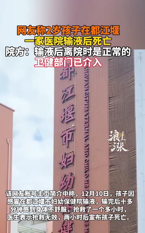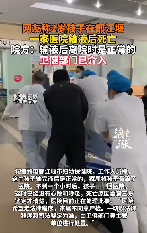 官方通报男童输液后离世事件,细节曝光…… 12月12日,四川的网友在社媒发视频哭诉,自己2岁多的孩子去医院输液后离世! 该网友透露,孩子在输液之后10几分钟就发现身体不舒服,在抢救一个多小时后,抢救无效宣告死亡。 值得一提的是,该网友表示,自己孩子是第一次输液,没想到第一次输液就出现了这种情况。 该网友的哭诉发布到网络之后,就引发网友热议,一个生命就这样消逝,太惋惜了! 于是涉事医院都江堰市妇幼保健院回应了几个关键点: 其一,孩子是在医院输完液之后,家长自行将家长带离的。 其二,孩子是在输完液离开医院不到1小时,再次带回医院,这时候状态非常不好,已经没有心跳与呼吸了。 其三,对于孩子离世很悲痛,但孩子具体死因需要第三方鉴定,但家长不同意尸检,建议家长走法律程序。 那么,到底是怎么回事呢?卫健委经过初步调查,透露了更多细节: 离世的孩子年仅33月,12月10日晚上7点的时候,孩子因为流感病毒肺炎在医院办理了住院。 在打完点滴之后,家长就自行将孩子带离了医院。 晚上11点半左右,家长再次将孩子带回医院,这时候孩子已经没有生命体征了,尽管医院全力抢救,但最终还是抢救无效离世。 接下来,卫健委已经介入,积极引导家长通过司法途径查明孩子死因! 从通报中可以看出孩子家长还是比较疏忽大意的,一般来说,病毒性肺炎是需要住院消炎之后才会带离医院。 但这个孩子的家长只是让打完点滴,且是孩子第一次打点滴,且还在住院期间,就直接带离了医院。 目前,家长希望找到孩子死因,网友纷纷建议尸检,不然真的无法定性死亡原因。 但才2岁的孩子离世,是个惨痛的教训,以后家长带孩子一定要慎重再慎重。