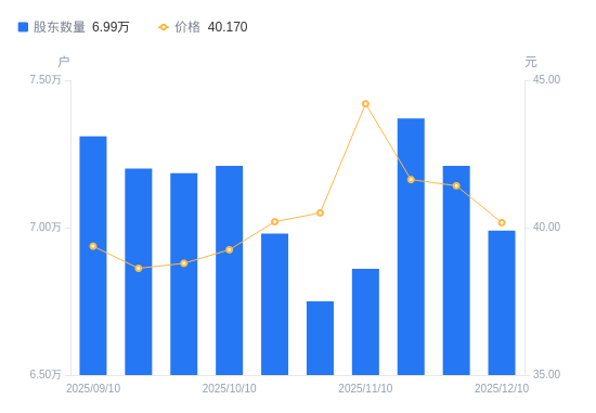 日期A股户数(户)流通A股户均持股数(股)户均持股市值(万元)2025-12-10699006642.5226.682025-11-28721006439.8426.672025-11-20737006299.9626.232025-11-10686006768.3229.922025-10-31675006878.6227.862025-10-20698006651.9626.742025-10-10721006439.4925.282025-09-30718486462.0825.072025-09-19720006582.8025.422025-09-10731006483.7525.53