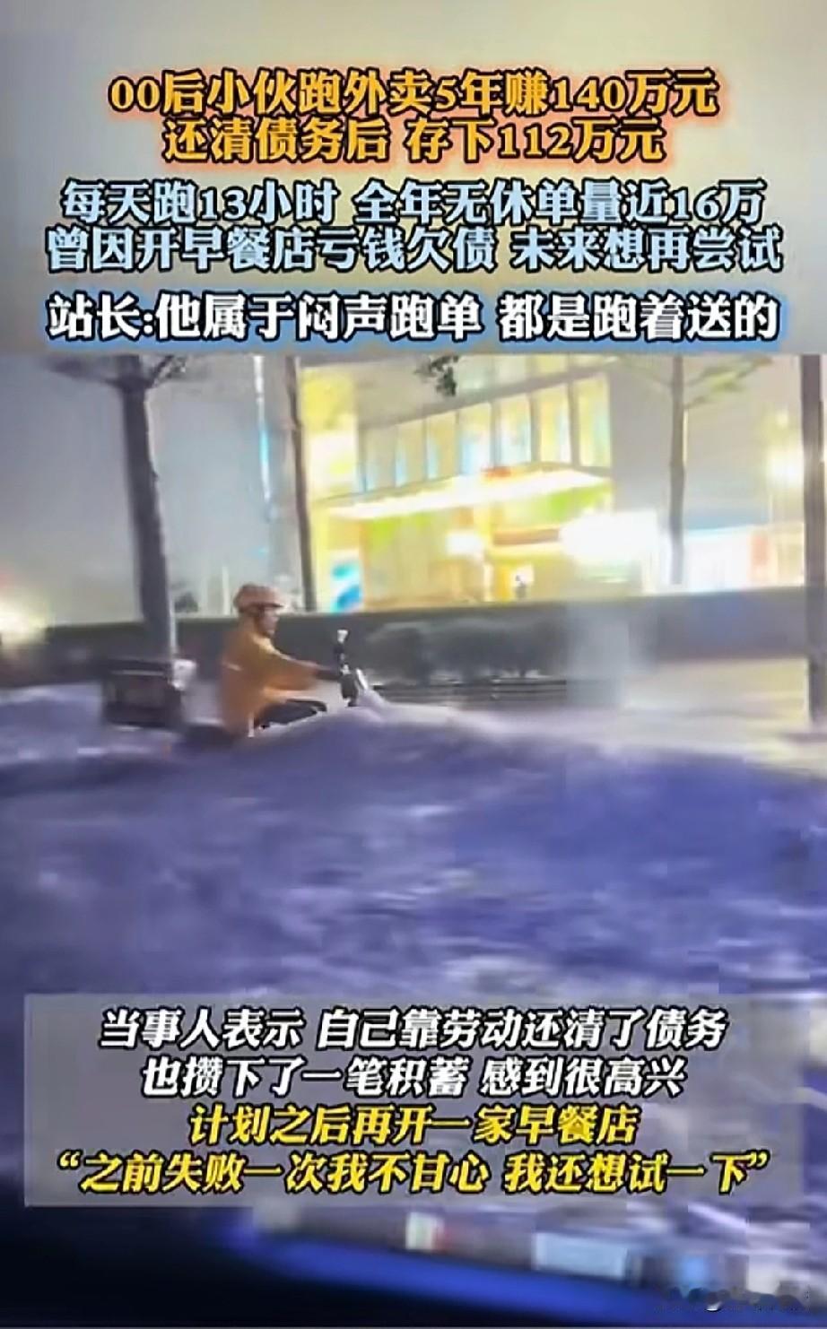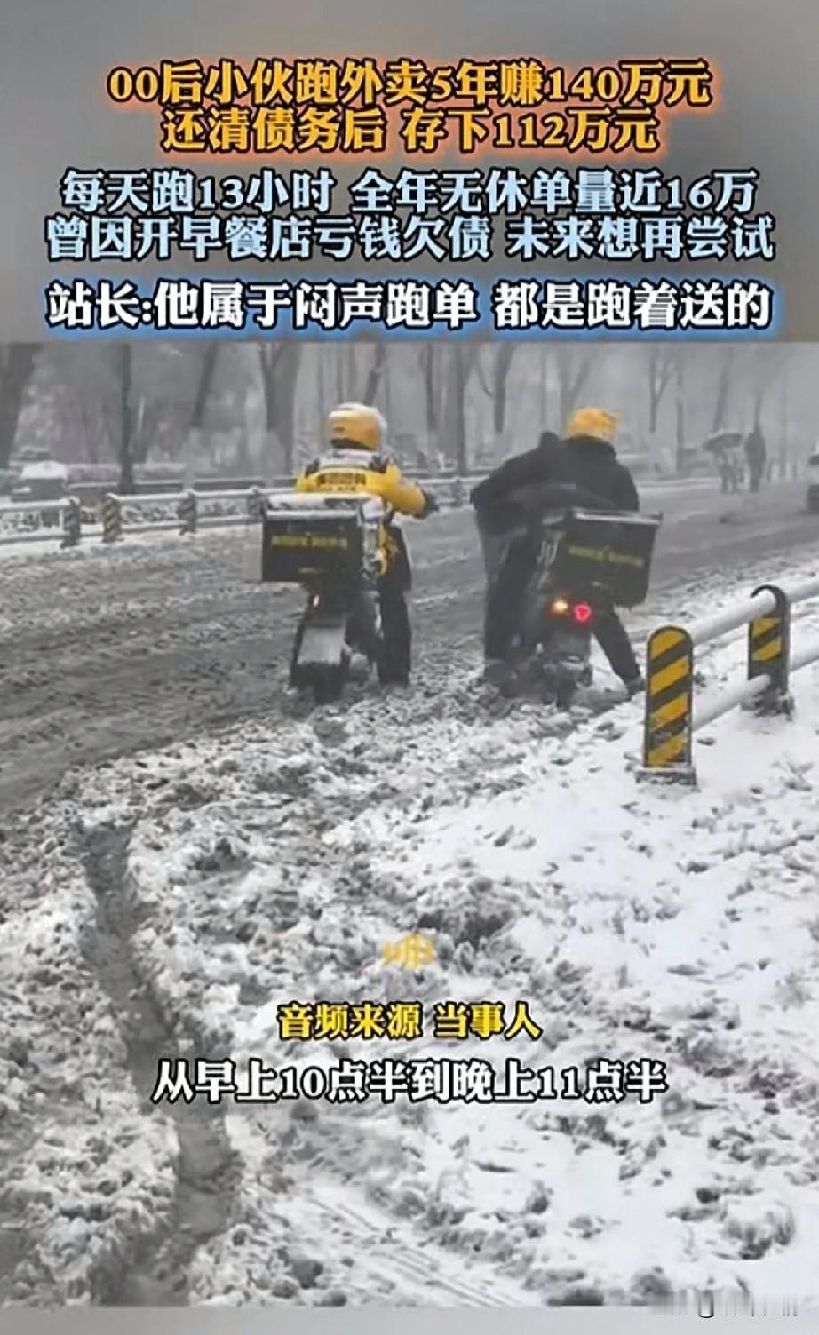 00后小伙跑单5年赚了140万, 还清债务后存下了112万, 每天跑单13个小时, 全年无休单量近16万, 因为开早餐店欠债, 本来还想再次尝试, 站长表示他就是闷声跑单, 都是跑着送单的, 小伙表示都是靠自己的努力才做到, 风雨无阻从来不休息, 不仅还清了债务, 攒下了一笔钱, 从哪里跌倒就想再从哪里站起来, 计划日后再开一家早餐店, 这样的人做什么都会成功, 因为他们无所畏惧, 大家对于这样的00后怎么看? 你们觉得送外卖丢人吗 兼职外卖跑单 跑腿一天收入 业余跑单 跑单经历 小哥跑单日常 小哥跑单 跑单心得