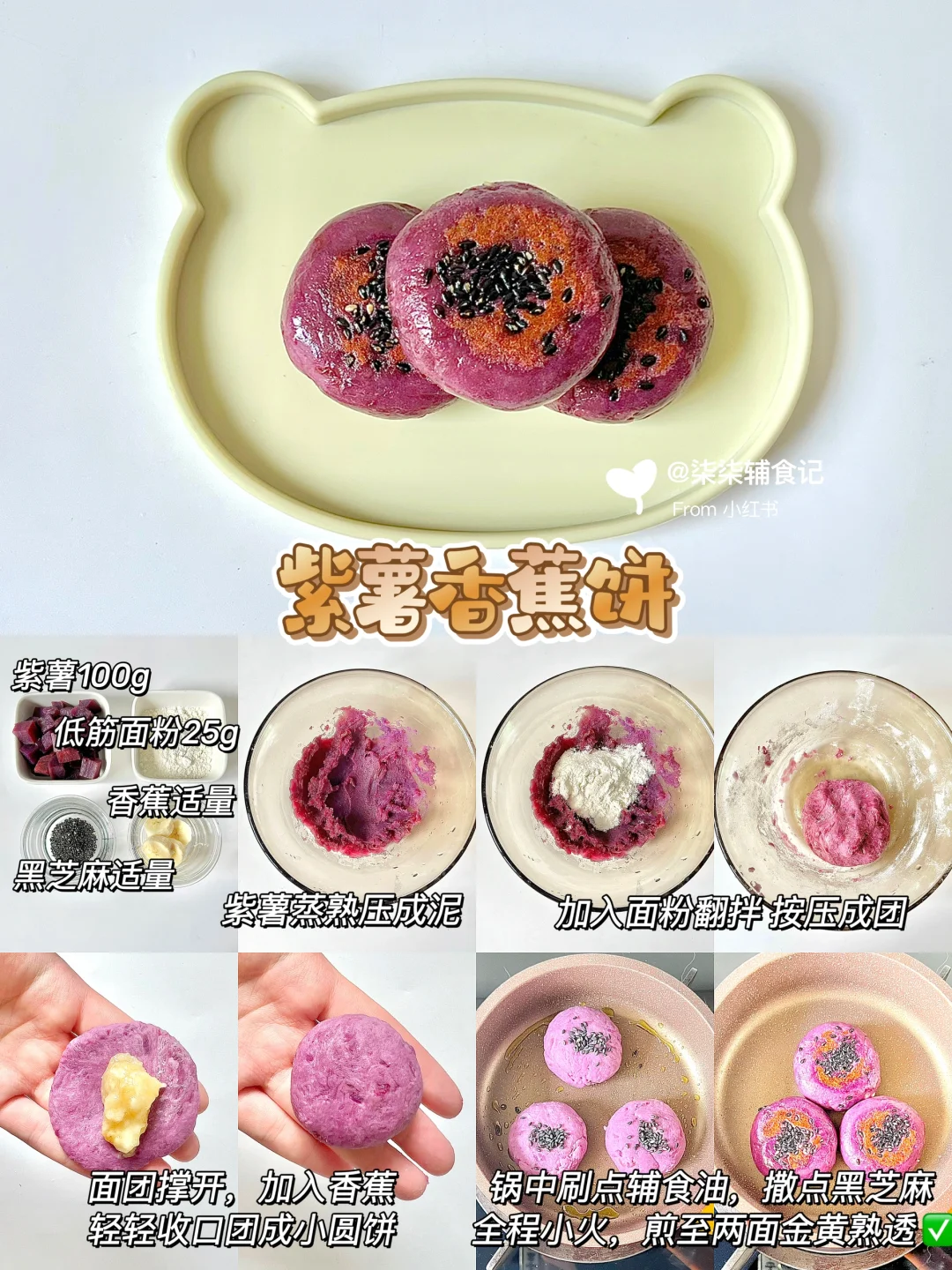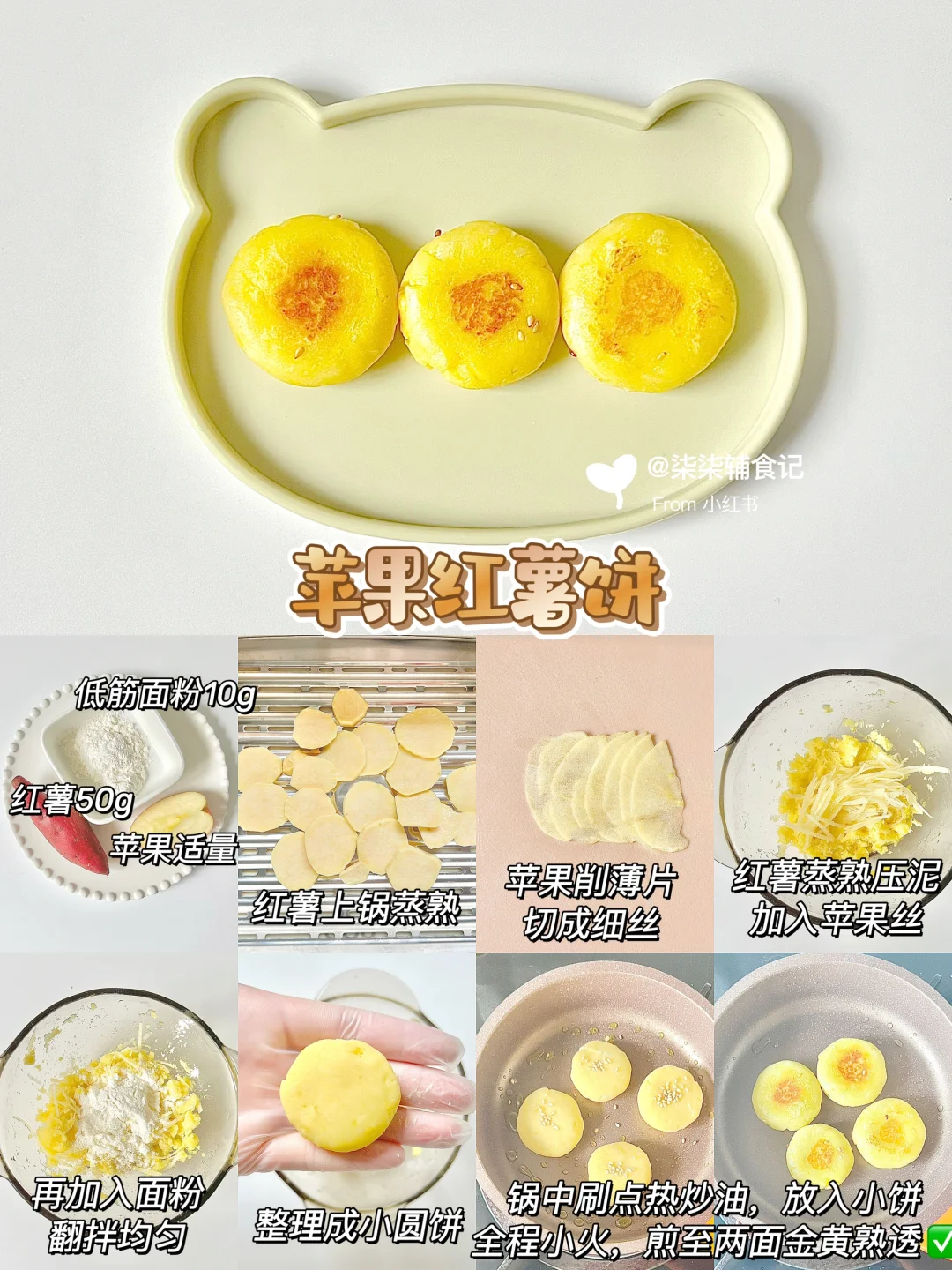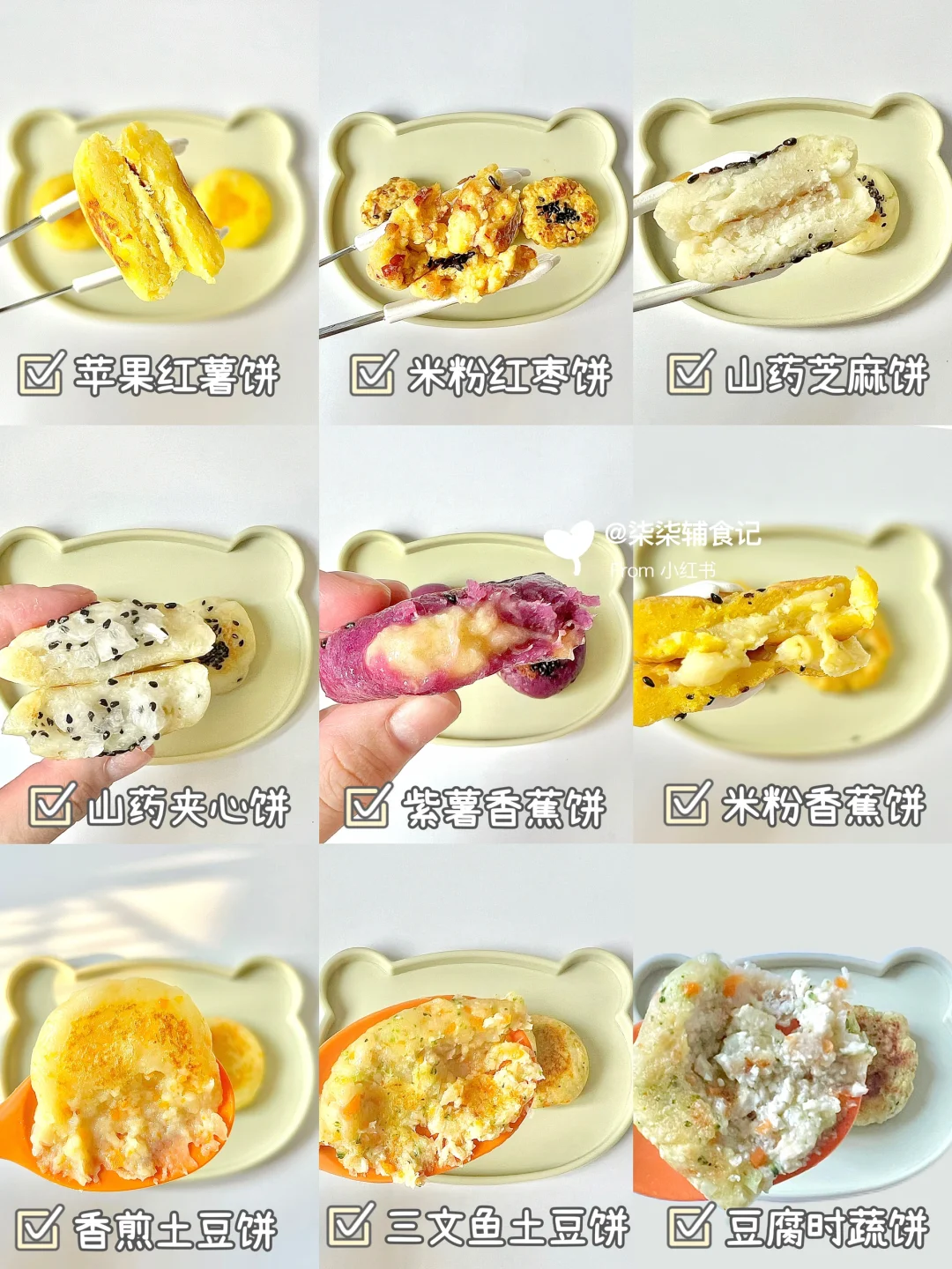 来给大家分享小饼制作方法啦~ 可以锻炼宝宝咀嚼能力、手眼协调能力和手指抓握能力…都是简单好操作哦!非常适合新手麻麻~ 🧑🍳辅食小饼菜单⤵️ 🔸苹果红薯饼 🔸米粉红枣饼 🔸山药芝麻饼 🔸山药夹心饼 🔸紫薯香蕉饼 🔸米粉香蕉饼 🔸香蕉土豆饼 🔸三文鱼土豆饼 🔸豆腐时蔬饼 💡小tips: 🔺所有小饼煎的时候都要全程小火 🔺有一些小饼粘手,手上要抹点辅食油 🔺山药要买正宗铁棍山药,才不会粘手