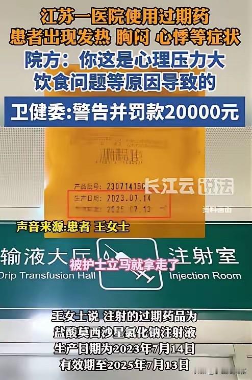 江苏泰州,女子肺炎去输液,吊针时她意外发现,注射液已过期45天,女子告知护士后,护士赶紧处理掉输液袋,之后院方表示,输了过期药水,对身体没有任何影响,没想到,次日女子就出现了发热、胸闷等症状,可院方却以女子心里压力大、饮食不佳等理由推托,提都不提药水过期的事。女子气不过,投诉到卫健委,结局让她始料不及。 “我到现在想起来都后怕,要是当时没多看一眼药水瓶,过期的药水就全输进身体里了。”王女士坐在家中,提起前不久中医院的输液经历,依旧心有余悸。 谁能想到,只是因为肺炎去医院输个液,竟会遇上注射液过期45天的离谱事,更让她寒心的是,院方后续的态度比过期药水更让人难以接受。 王女士因为肺炎引发的咳嗽、胸闷等症状,来到医院就诊,医生根据她的病情,开具了盐酸莫西沙星氯化钠注射液的输液处方。 在输液大厅等待护士配药时,王女士出于习惯,拿起即将输注的药瓶查看信息,这一看,让她瞬间惊出一身冷汗。 药瓶上清晰印着生产日期为2023年7月14日,有效期至2025年7月13日,而就诊当天已经是2025年8月底,这瓶注射液足足过期了45天。 发现问题的王女士立刻叫来护士,指着药瓶上的有效期提出质疑。让她没想到的是,护士在看到过期信息后,没有任何解释,而是迅速伸手将输液袋拿走,动作急切得仿佛要销毁证据一般,这一举动让王女士心里越发不安。 她找到医院相关负责人反映情况,希望得到合理的解释和处理,可对方的回应却轻描淡写,只说“输了过期药水没事,对身体不会有什么影响”,简单的一句话,就想将这件事翻篇。 尽管心里满是疑虑,但王女士想着或许是自己太过紧张,便没有再继续深究。可就在输液后的第二天,意外还是发生了。王女士开始出现发热、胸闷、心悸等不适症状,身体的难受让她立刻联想到那瓶过期的注射液,她再次赶到医院,要求院方给出说法。 然而,院方的态度发生了一百八十度转变,不仅绝口不提药水过期的问题,反而将王女士的不适归咎于“心理压力大”“饮食问题”,甚至暗示是她自己的情绪导致了身体出现异常,这让王女士又气又急。 多次与医院沟通无果后,王女士决定不再妥协,她整理好药瓶照片、就诊记录等证据,向卫健委进行了投诉,希望能通过官方渠道维护自己的权益。 卫健委接到投诉后,迅速展开调查,核实了医院使用过期药品的事实。2025年12月3日,官方平台公布了处罚决定,卫健委中医院作出警告并罚款2万元的行政处罚。 这份迟来的处理结果,让王女士既感到一丝欣慰,又觉得有些始料不及,她从未想过医院会在药品管理上出现如此低级且危险的疏漏。 这件事被曝光后,迅速在网络上引发热议,网友们纷纷发表自己的看法。有网友留言:“医院是救死扶伤的地方,药品管理居然这么松懈,过期45天的药都能拿出来给患者用,想想都后怕!” 还有网友表示:“院方一开始的态度太气人了,出了问题不反思还甩锅,这是对患者的极不负责。” 也有网友感慨:“幸好患者细心发现了,不然后果不堪设想,医院的药品管控必须严上加严。” 医院作为医疗服务机构,药品安全是保障患者生命健康的第一道防线,哪怕是一丝一毫的疏忽,都可能引发严重的后果。 这家医院的这起事件,不仅暴露了医院在药品采购、储存、使用等环节的管理漏洞,也让人们看到了部分医疗机构在面对问题时的推诿态度。 而王女士的经历也提醒着每一位患者,在就医过程中要多一份细心,关注自身诊疗的每一个细节,当合法权益受到侵害时,要敢于拿起法律武器维护自己的权益。 同时,也希望医疗机构能以此为戒,加强内部管理,真正将患者的健康放在首位,避免类似的事件再次发生。 要不要我帮你整理一份该事件中患者维权的关键证据清单,方便遇到类似情况时参考?