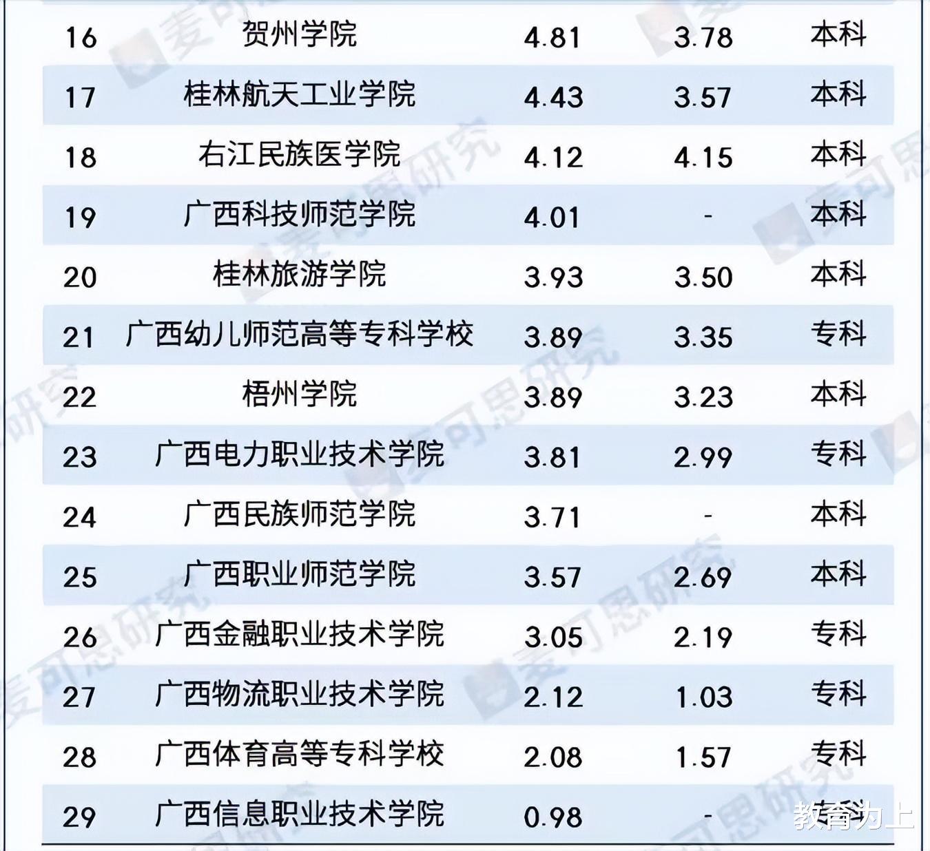 在这份榜单中,共计29所广西高校进入榜单,既包括省属重点大学的广西师范大学、广西医科大学等,也包括高职院校的广西电力职业技术学院、广西金融职业技术学院、广西信息职业技术学院等。