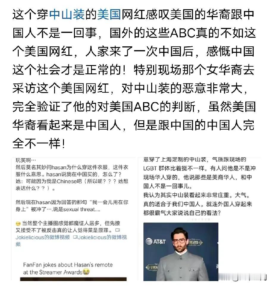 美国华裔地位低真的是自己作出来的,真的不能怪别人歧视它们,美国这些华裔对自己母国一切的敌意比老外还要严重,美国普渡大学的华裔校长拒绝中国留学生,这个华裔还是在内地出生的,十来岁移居香港,后面有移民美国;还有这个穿中山装的美国网红出席颁奖礼,没想到对中山装恶意最大居然华裔主持人,各种污言秽语,而这个白人网红强势维护,这些美国华裔难道不懂一个道理,它们这些做,只会让美国人越来越看不起它们吗?它们越是否认,越是针对母国的一切,它们在美国的地位就越低!