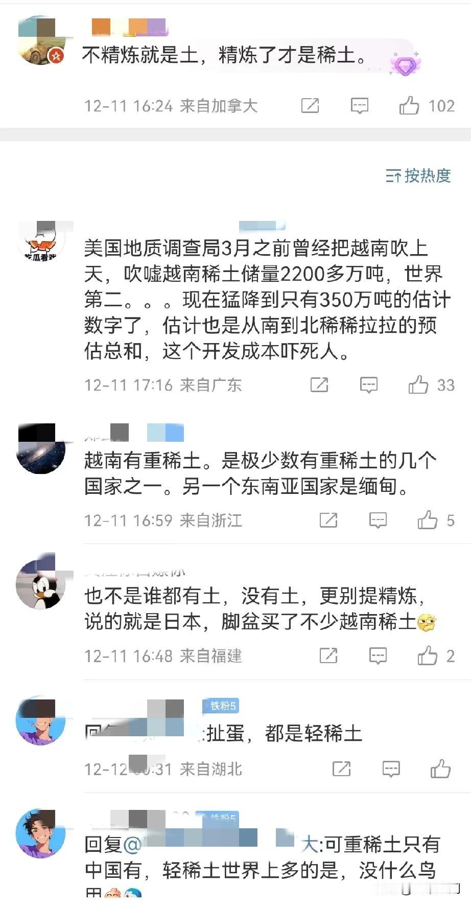 越南立法禁止稀土出口了,这些国家都以为自己能跟我们一样,也能开发稀土,之前美国吹越南有2200万吨稀土储量,结果今年3月份又说越南只有350万吨稀土,这个世界根本就不缺稀土,特别是轻稀土,根本就不缺,缺的是提炼技术,除非你有重稀土,这个世界只有几个地方有重稀土,一个就是中国的江西云南,一个就是缅甸的背部,现在我们国内的重稀土几乎几乎不开采,都是进口缅甸的重稀土矿进来提炼的,然后在做成磁铁成品出口出去的,很多国家都以为中国可以做到,它们也可以做到,越南还是先解决缺电的问题,再来谈攻克稀土提炼技术吧!