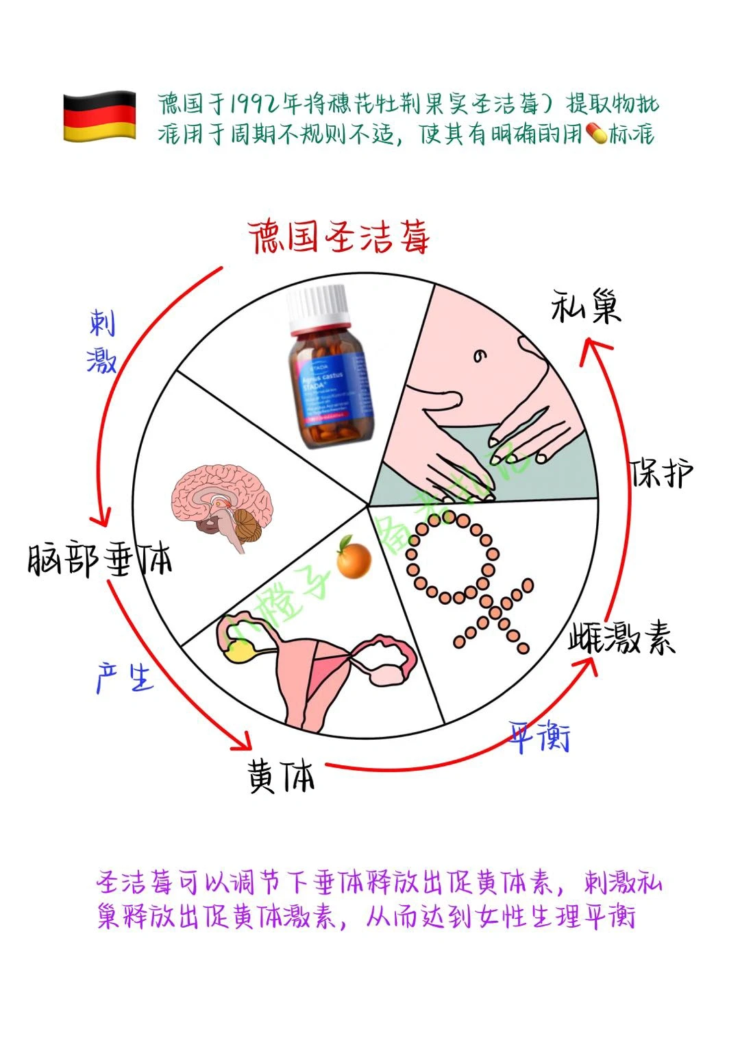 德国圣洁莓 含有一种类似人体黄体素的成分,可以缓解经期不适,改善烦躁情绪,规律周期,促进人体孕激素的生成,养护卵巢。