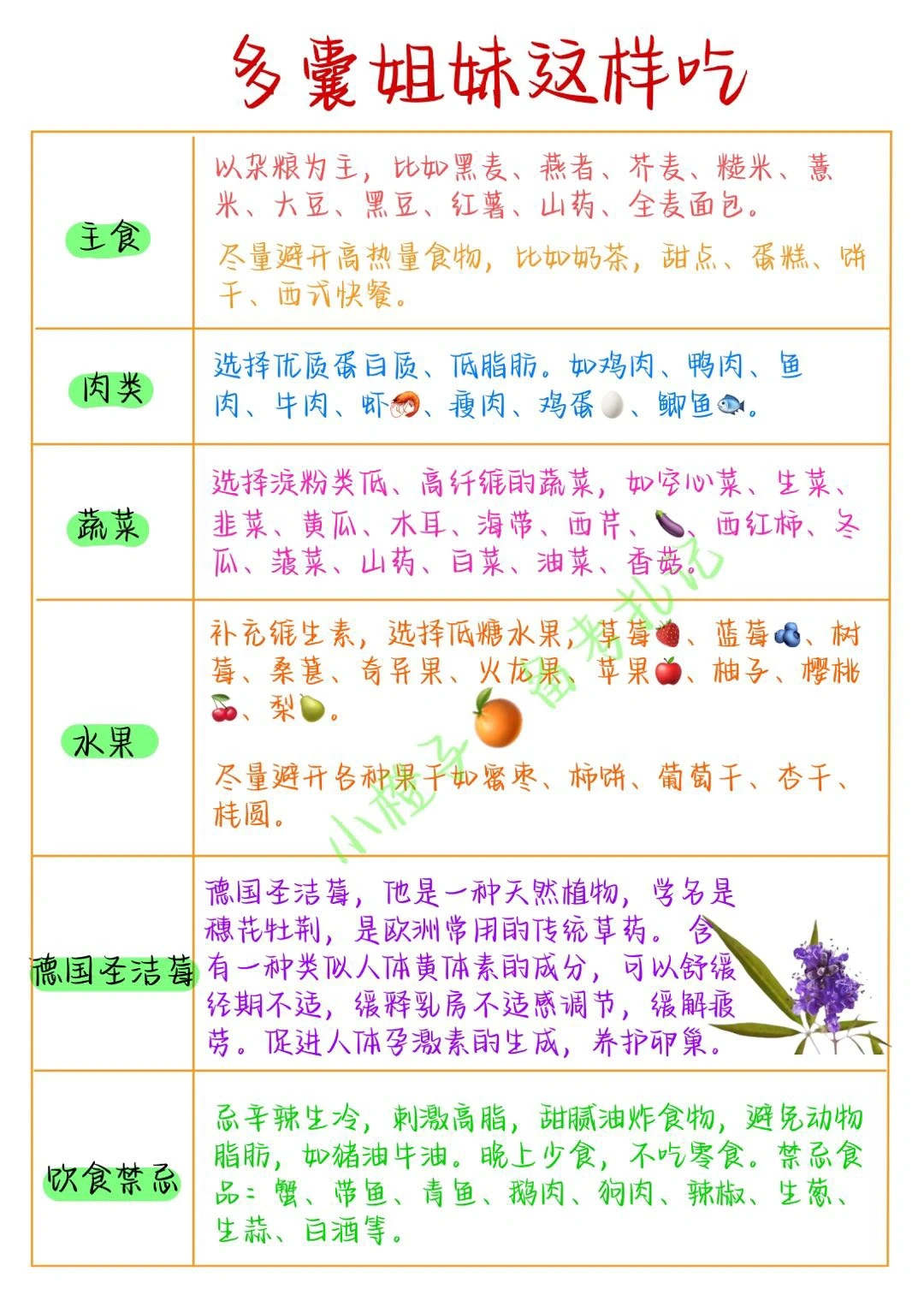 多囊姐妹在主食方面可以以杂粮为主,尽量避开高热量的食物,在肉类选择优质蛋白质,蔬菜类选择淀粉类低,高纤维的蔬菜,水果能补充维生素,选择低糖水果,尽量避开各种果干。忌食辛辣生冷,刺激高脂,甜腻油炸食物。