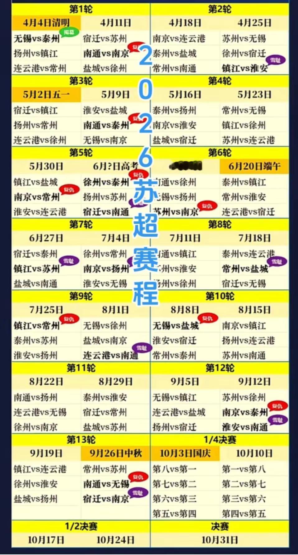 江苏:2026苏超赛程表! 江苏城市足球联赛