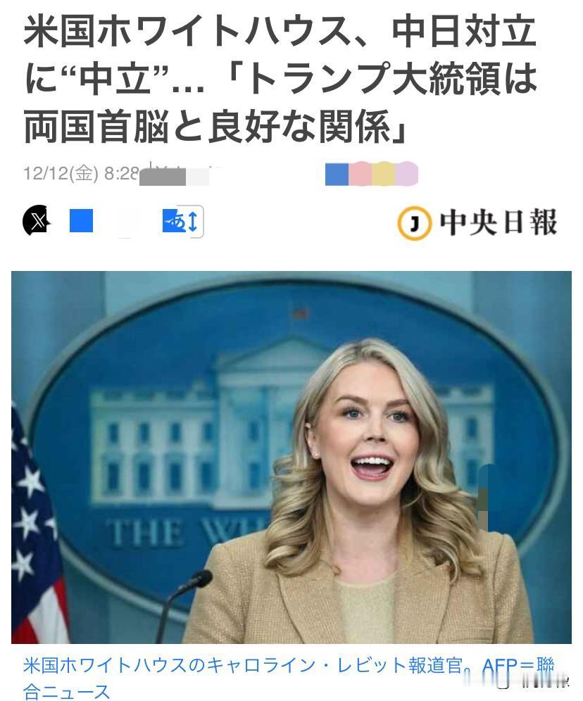 日本媒体爆料:美国居然 宣布了保持中立立场,不参与 近日来中日之间发生的外交纷争。 日媒言外之意就是太让日本失望, 简直就是同盟不同心,被出卖了。 12月12日,美国白宫发言人 “卡罗琳”在发布会上甜美的说: “中国与日本在美国的立场上来说 都必须保持良好关系。” 众所周知,美国是日本最大的靠山, 这回美国却宣言要同中日双方同步 保持友谊。不站队的举动让日本政府 心底瓦凉瓦凉,下一步都不知道 如何是好。
