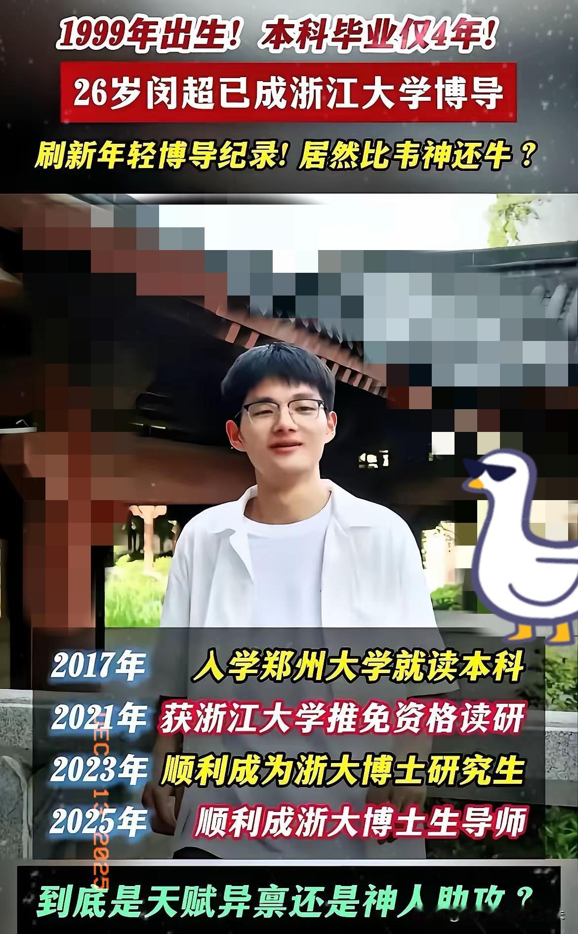 浙大26岁博导闵超,最近真是被网友扒得底裤都不剩了。刚开始我还以为是哪个实验室出了“爱因斯坦”,结果凑近一看简历,差点笑出声。这哪是什么硬核科研成果啊?全是些花里胡哨的“文艺汇演”经历,这就评上博导了? 不是说年轻不能当博导,但学术头衔得靠真本事撑着吧?没见拿得出手的科研突破,反倒全是些和学术无关的履历,这样的选拔标准实在让人看不懂。再看看北大韦神,28岁博士毕业也才是副教授,人家靠的是实打实的学术能力,凭实力圈粉无数。 一边是靠硬核实力稳步晋升,一边是履历注水却头衔加身,这样的对比简直扎心又讽刺。浙大这次操作真的让人下头,学术圈的门槛不该这么随意降低,寒了真正埋头钻研的学者的心,百年名校的招牌也经不起这样消耗。 学术选拔要是不看真才实学,只拼花架子履历,最后只会让学术变味。你们觉得年轻学者晋升,该重履历包装还是重硬核实力?来评论区聊聊你的看法!