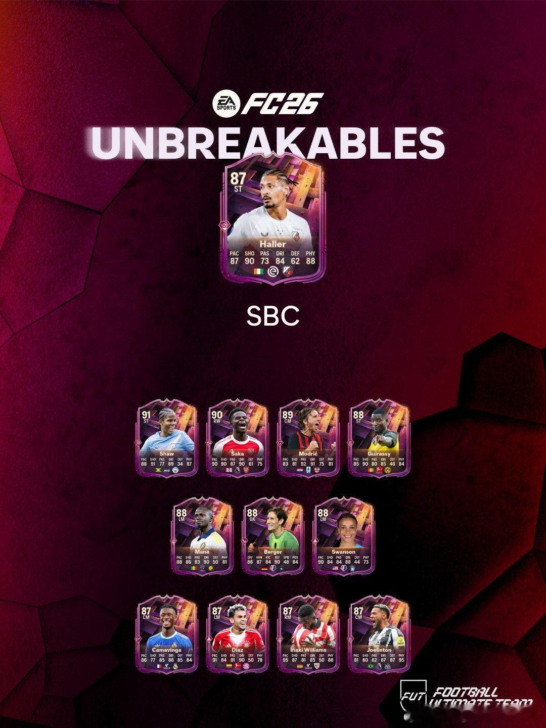 12月13日新增SBC:• 坚不可摧挑战 1• 83+ TOTW 升级• Sébastien Haller• Clint Dempsey• 英超十一月最佳球员FC26 cr:PlayFC