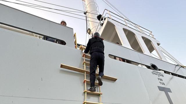 边检民警登轮查验。由受访单位供图