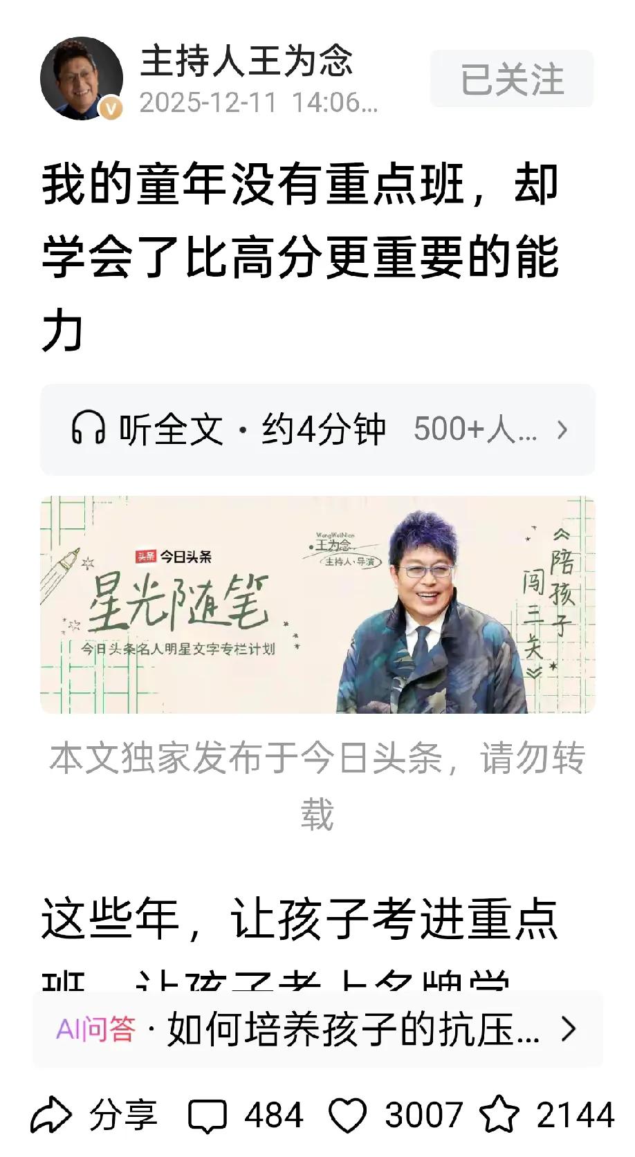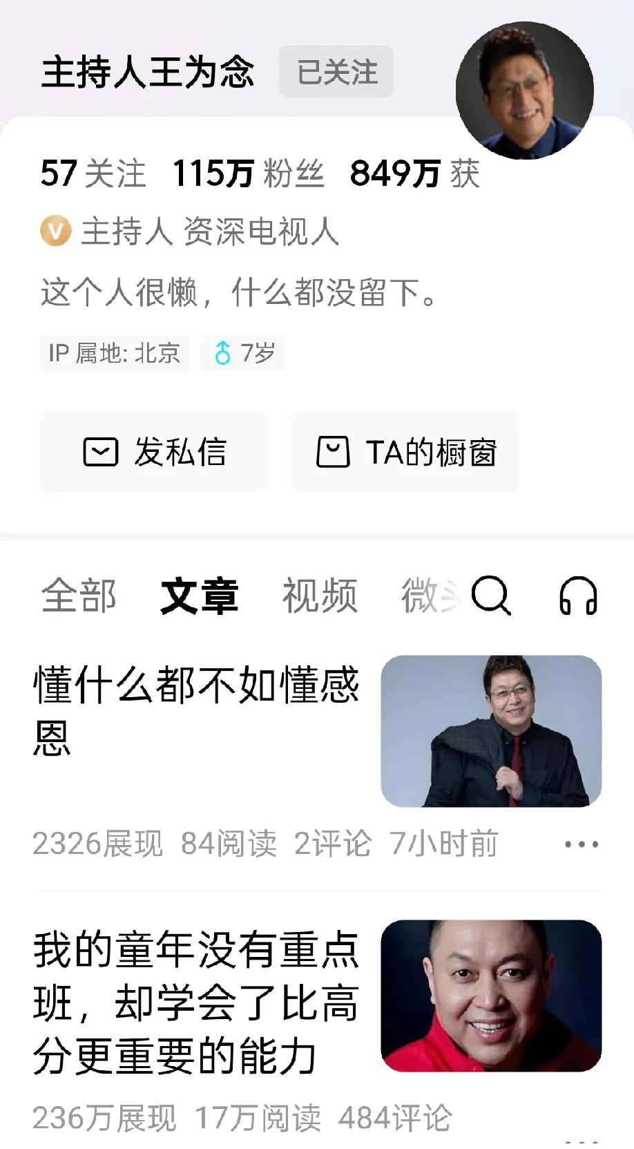 今天在头条上看了主持人王为念写的一篇文章,名字叫《我的童年没有重点班,却学会了比高分更重要的能力》。 这是我第一次拜读王主持的文章,也是在头条上第一次遇见他。 在头条上,其实是有许多名人入驻的,各行各业的杰出人士都在头条上开了财户。 对于主持人,别看他们在电视上主持节目时得心应手,游刃有余,出口成章。 但是,真正入驻头条的许多主持人都不善于写作,大多数都是发布一些小视频,利用名人效应带带货而已。 但是王为念好像是特别的一个主持人,他在头条上还写了好几篇文章,而且篇篇都是爆文,百多万,几百万的展现量。 比如这篇《我的童年没有重点班,却学会了比高分更重要的能力》,展现量高达250多万,阅读量是17万多。 他在头条上的粉丝量也有115万多,看来这人还蛮招人喜欢,今天我也关注了他。 文章还算有内容,有思想,但是个人认为他在文笔的运用,和文彩的修饰,以及章法上却不怎么样。 该篇文章我看了一遍,是谈论关于培养子女成才的问题,主要思想就一句话: 考上重点大学的不一定就会成才,而进了普通大学的,也不一定就没有光彩的人生。 作者还利用自己的人生成才经历,来说明了一个人最重要的是要学会解决各种社会和人生问题的能力,而不是一定要进入一所名牌大学。 王为念在很早以前就演过一部电影,好像是《杨五郎大闹五台山》,他就饰演了主角杨五郎。 这部电影我也看过,不过年代久了记不清内容了,那时的王为念应该刚刚出道,还没什么名声,大概也还不是主持人。 王为念正式进入主持界、从幕后转型台前的时间是2008年,受主持人王芳邀请,参与北京电视台青少频道情感谈话节目《谁在说》的录制,这也是他主持生涯的关键起点。 王为念1996年进入中央电视台,近10年里多次参与央视春晚的策划、导演、编舞工作,还曾凭借春晚相关节目获奖,积累了扎实的电视行业经验。 2008年通过《谁在说》崭露头角后,他用5年时间成功成长为国内优秀的谈话节目主持人,后续又搭档王芳主持了《大王小王》《向幸福出发》等知名节目,逐渐被观众熟知。 看来王芳还是挖掘出他的伯乐,也算是他的贵人,王为念也算是大器晚成的一匹千里马。
