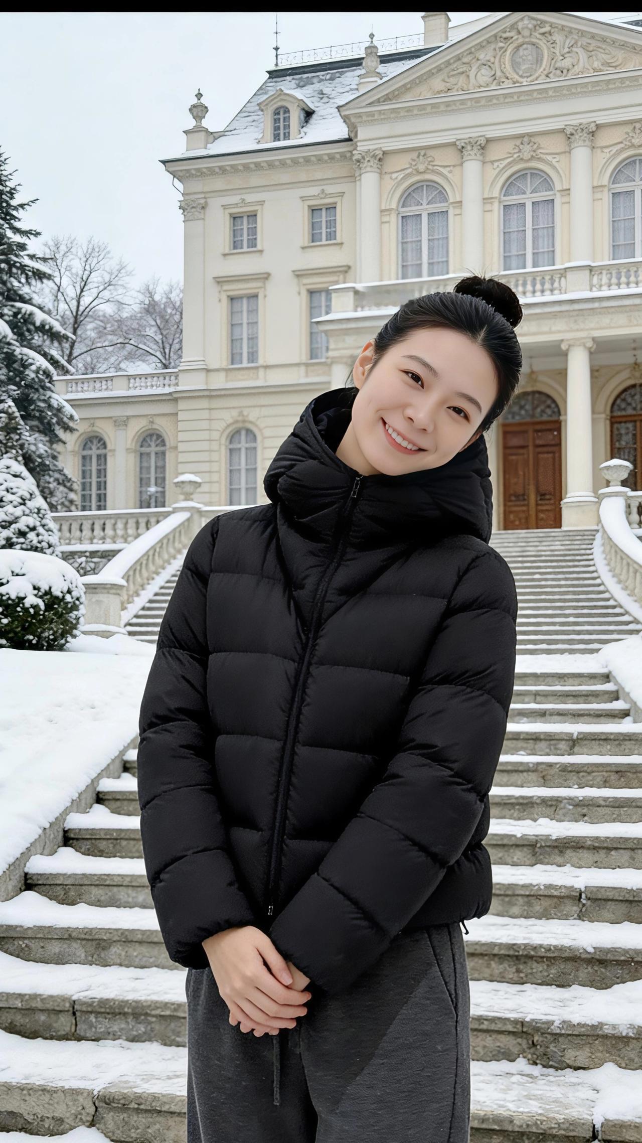 雪邸暖冬 雪落在欧式宅邸的穹顶与廊柱上,把米白的石材衬得愈发温润,鎏金的雕花裹着雪绒,像给古典的建筑缀了层软糖。深蓝与鎏金相映的宫殿立在雪野里,蓝白的撞色揉着冬日的清冽,却被姑娘身上的黑色短款羽绒服,揉进了融融的暖。 她扎着利落的丸子头,手插在裤兜时,黑羽绒的蓬松与灰阔腿裤的垂坠相映,像把冬日的冷意都收进了衣摆。抬手理鬓的瞬间,雪絮落在肩头,她回眸笑时,眼底盛着雪光,比宅邸的雕花更鲜活。站在覆雪的石阶前,双手交叠的温柔,又让凛冽的冬,多了几分软意。 黑与灰的搭配,本是冬日里最沉静的笔触,却因她的笑,在雪地里晕开暖意。宅邸的雪还在积,衣间的暖却漫出来,把异国冬日的清冷,酿成了触手可及的温柔。原来最冷的天,最简约的穿搭,也能盛下最鲜活的欢喜高级感穿搭 冬季穿搭 羽绒服穿搭 女装穿搭