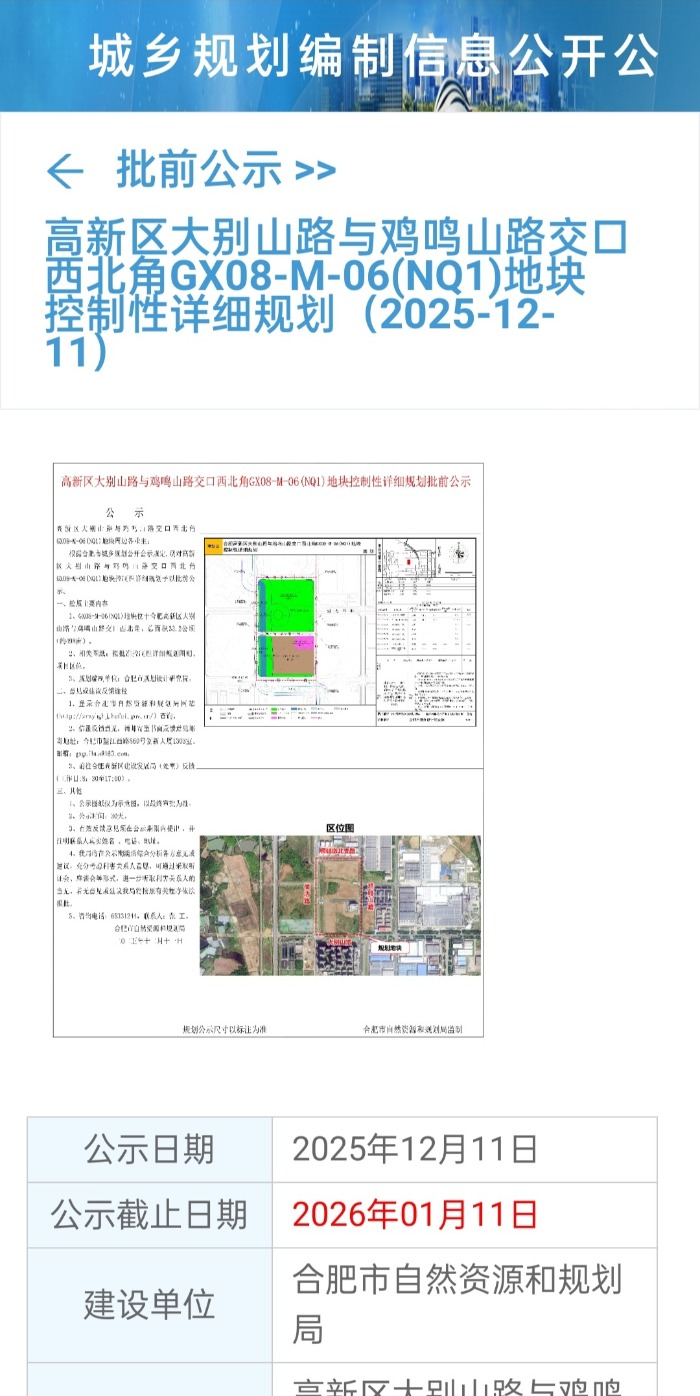 12月12日上午,大皖新闻记者拨打了批前公示牌上的咨询电话,合肥市高新区建设发展局相关人士介绍,师姑墩遗址所在地块规划为公园绿地,目前是批前公示阶段,正在征求各方意见,包括群众和部门的意见。目前该规划处于30天公示期内,欢迎大家反馈意见建议。