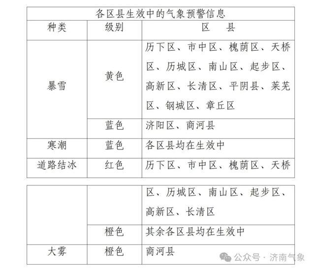 济南市气象台2025年12月13日06时继续发布道路结冰红色预警信号、暴雪黄色预警信号及寒潮蓝色预警信号,请注意防范。