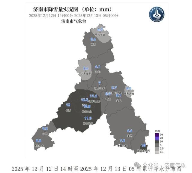 根据气象观测站网统计,2025年12月12日14时00分至2025年12月13日05时00分降水量(毫米):全市平均8.3(市中区济南最大12.5),折合水量约0.85亿立方,市区12.5长清区11.8平阴县9.2济阳区6.1商河县4.9章丘区6.1莱芜区7.2钢城区10.0南山区11.2起步区3.4历城区11.6高新区8.0。