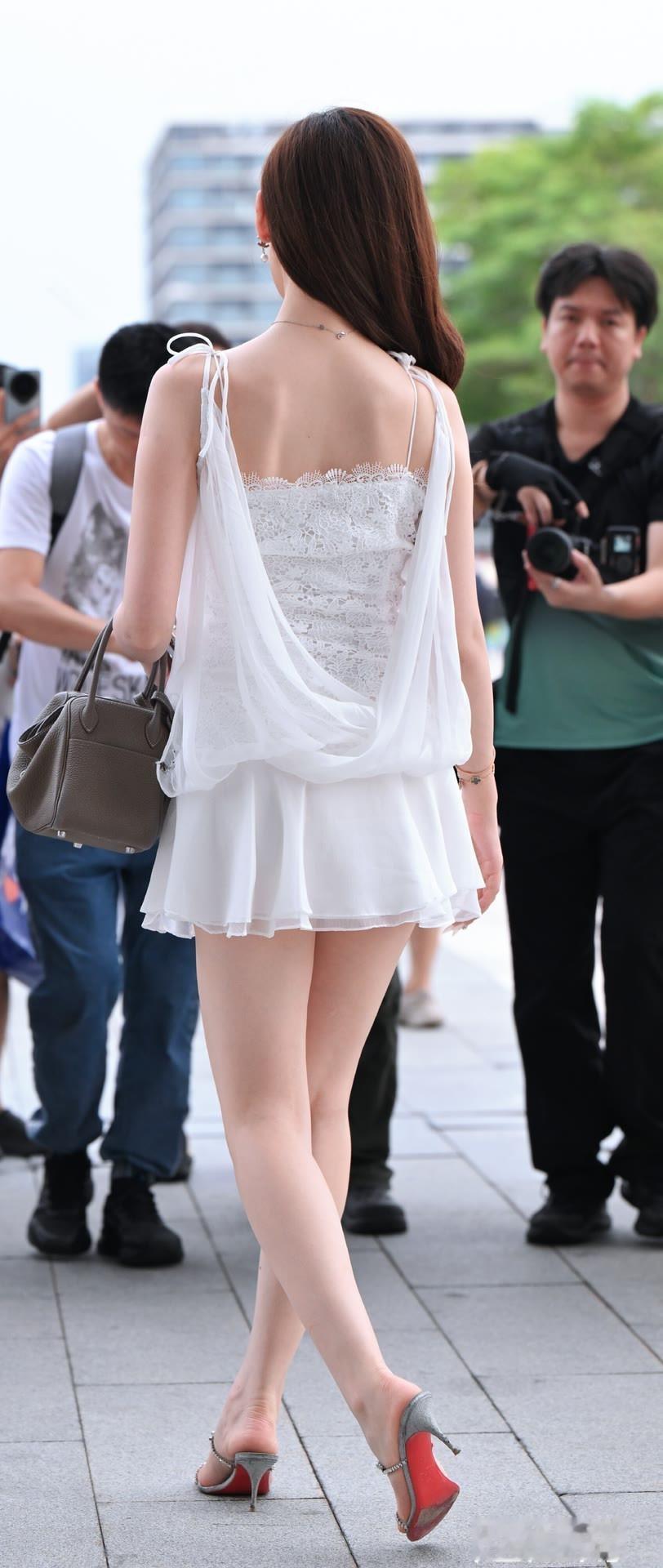 一袭白裙,解锁都市轻法式浪漫。 白色蕾丝吊带短裙是视觉的焦点,蕾丝拼接轻纱的设计兼具精致与飘逸,短款裙摆拉长腿部线条,吊带款式又增添了轻柔性感,整体版型简约又细节满满。 灰色质感手提包中和了白裙的甜腻,增添了都市的优雅;水钻细高跟凉拖与红底鞋设计,既呼应了裙装的精致,又用亮眼细节提升了造型的吸睛度;简约的首饰点缀,让整体搭配不浮夸又有层次感。 全白的裙装主打清新纯净,搭配浅灰色包包和银色鞋履,色彩和谐统一;纱质,蕾丝与皮质的材质碰撞,让穿搭在柔媚中多了一份质感。 整体氛围是甜欲交织的都市轻法式浪漫,白裙的仙系质感营造出温柔甜美的形象,而红底高跟鞋和精致配饰又带出轻熟的妩媚感;街头镜头下的姿态灵活自然,既有被镜头捕捉的从容,又有不经意的妩媚,清冷又甜美的气质让她在人群中格外亮眼,形成了"甜而不腻,媚而不俗"的独特氛围。