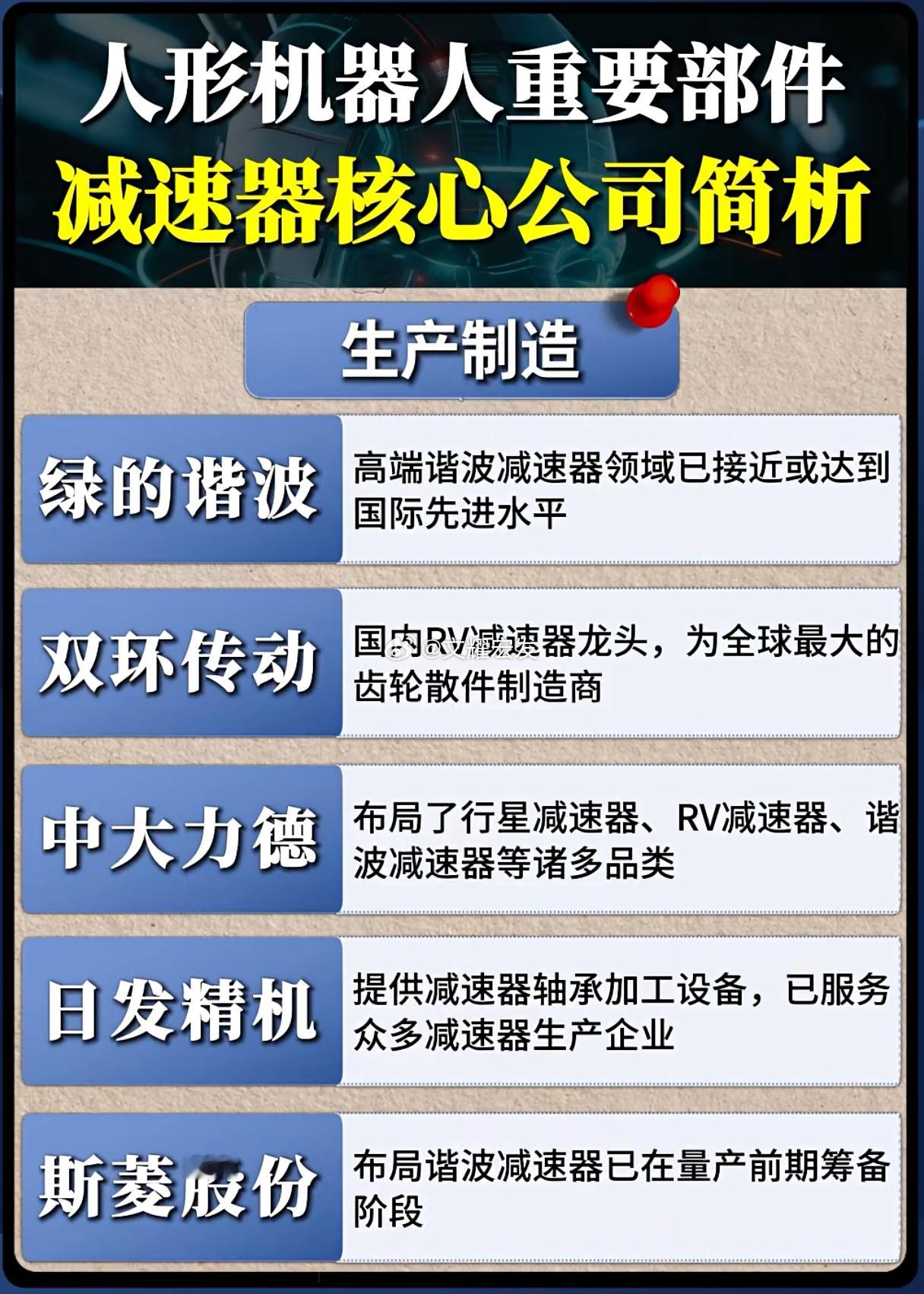 人形机器人关节核心部件实现自主突破,中国减速器产业链完成全链条布局随着人形机器人产业化进程加速,作为“机器人关节”核心部件的减速器正迎来关键发展阶段。中国已构建从基础材料到精密制造的全产业链体系,在谐波减速器与RV减速器领域取得实质性突破,为机器人产业发展提供坚实支撑。一、材料基础实现自主可控核心材料:$宝钢股份 sh600019$ 的高精度碳钢薄板成为齿轮制造关键基材特种材料:$金发科技 sh600143$ PEEK材料使耐磨部件寿命提升40%轻量化材料:$创新新材 sh600361$ 铝合金与宝武镁业镁合金实现结构优化核心配件:$五洲新春 sh603667$ 的柔性轴承已实现谐波减速器批量配套二、制造技术取得重要突破谐波减速器:绿的谐波产品性能达到国际先进水平,在协作机器人领域市场份额超过60%RV减速器:双环传动产品进入特斯拉Optimus供应链,齿轮散件供应全球市场全品类布局:中大力德覆盖行星、RV、谐波三大品类,满足不同关节需求产能扩张:斯菱股份等企业加速量产筹备,行业供给能力持续增强三、产业发展进入新阶段2025年全球人形机器人减速器市场规模预计突破50亿元。目前中国减速器国产化率已从30%提升至75%,形成完整的产业链协同创新体系。随着绿的谐波、双环传动等领军企业持续突破技术瓶颈,国产减速器在精度、寿命、可靠性等关键指标上不断提升,为人形机器人的规模化应用和成本优化奠定坚实基础,助力中国在全球机器人产业竞争中占据有利位置。