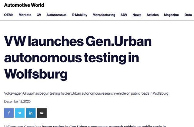 [环球网科技综合报道]12月13日消息,据AutomotiveWorld报道,当地时间12月12日,大众集团在德国沃尔夫斯堡正式启动全新自动驾驶研究车Gen.Urban1的道路测试。此次测试并非侧重车辆自动驾驶技术本身,而是聚焦用户在无方向盘、无踏板的自动驾驶场景中的真实体验与接受度,旨在深入探索乘客适应模式及车内行为特征。