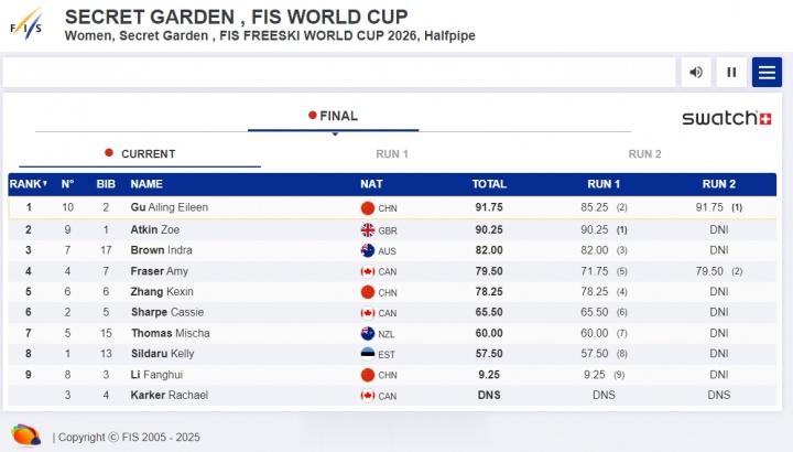 直播吧12月13日讯国际雪联自由式滑雪U型池世界杯云顶站决赛,谷爱凌第二跳获得91.75分,逆转夺冠,在“福地”实现了世界杯三连冠!
