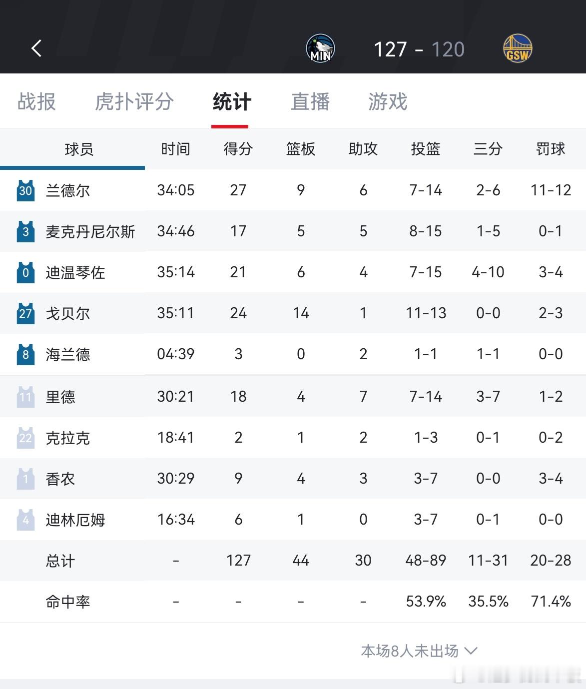 勇士120-127不敌森林狼库里39分,兰德尔27分,戈贝尔24分14板,迪文琴佐21分森林狼vs勇士