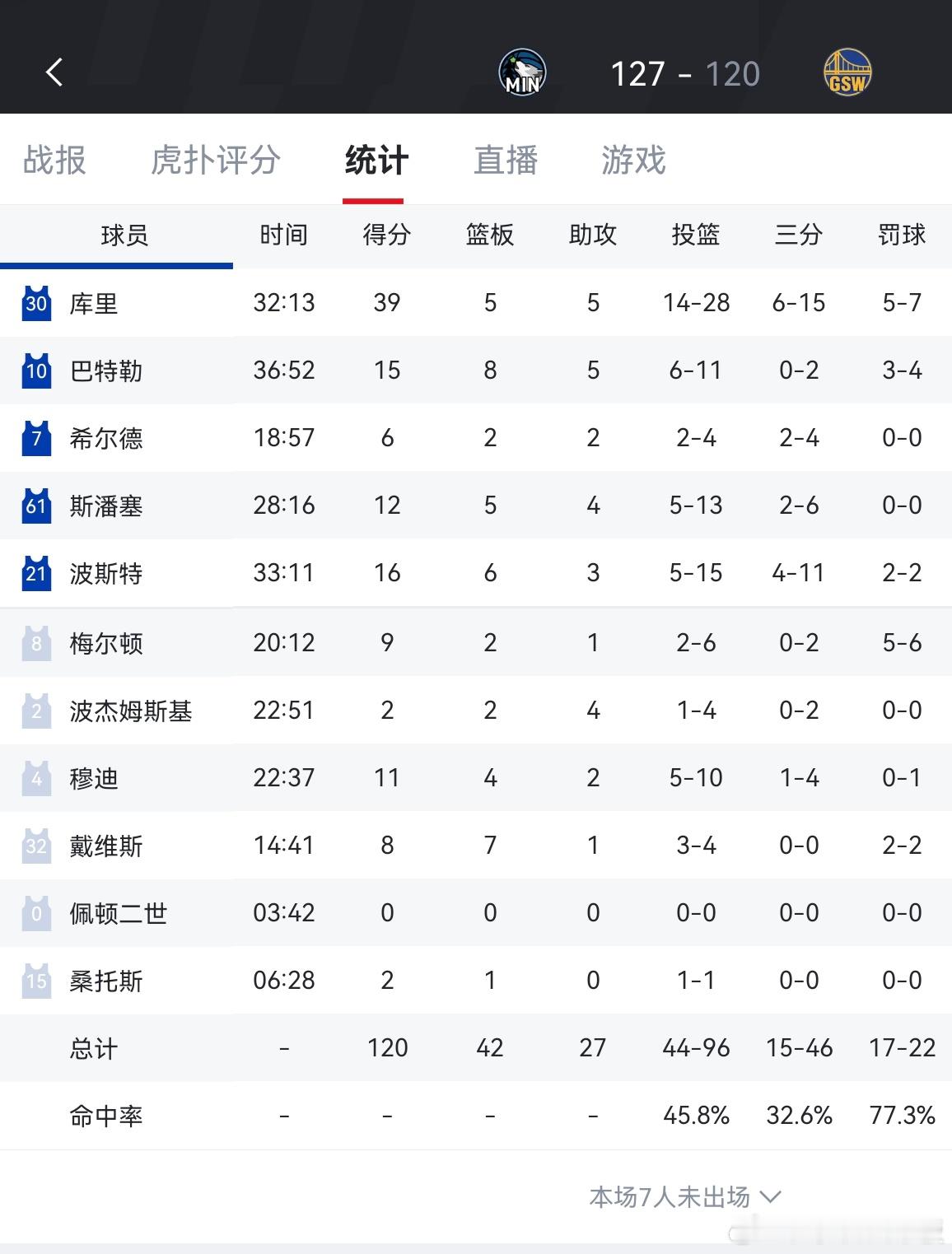 勇士120-127不敌森林狼库里39分,兰德尔27分,戈贝尔24分14板,迪文琴