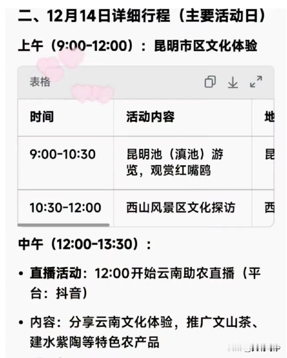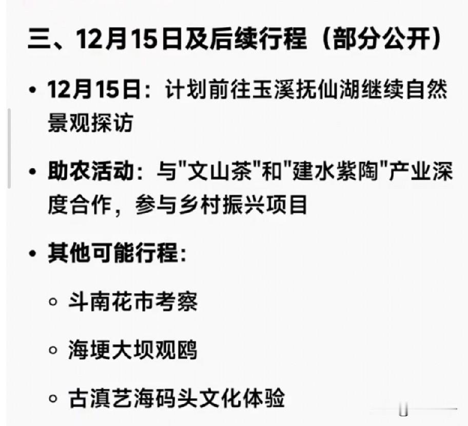 上海流浪、流量大师沈巍明日助农直播预告,沈大师助力云南欠发达地区:文山州麻栗坡县古树茶走向世界,功德无量!今年曾有位家喻户晓的华女士推荐过文山古树茶,文末图片中大家可以看看她到底是谁?应该是无人不知,无人不晓。 12月14日(昆明核心活动日) 9:00 - 12:00:在云南民族村开展文化体验,沉浸式感受26个民族的特色风情,比如观赏民族歌舞、品鉴民族特色小食等;此外还计划打卡西山与滇池周边,近距离观赏冬季红嘴鸥,感受“睡美人”西山与滇池相依的自然风光。 12:00:启动助农直播,核心推广文山古树茶,直播中还会穿插分享上午的文化体验感悟,让观众在了解农产品的同时感受云南人文魅力。 14:00 - 18:00:继续打卡昆明的人文与自然景点,大概率会前往大观楼、海埂大坝等地,进一步体验滇中地区的自然风貌与人文底蕴。 当晚:受邀参与小型文化沙龙,和当地文化学者、手工艺人深入交流;沙龙结束后,将参加融入云南特色美食的当地晚宴。 12月15日及后续 12月15日:前往玉溪抚仙湖,先在古滇艺海码头参与文化体验活动,随后开展自然助农相关互动;当天还会专门对接文山茶种植户与建水紫陶手工艺人,深入了解两大产业的生产流程,为后续深度推广做准备。 待公开时段:计划前往昆明东川红土地观赏特色地貌并做文化解读;后续文化游学还将涵盖大理洱海、丽江古城、玉龙雪山、腾冲以及西双版纳等。 行程可能有所调整,期待您的关注!更期待沈巍先生有新的面貌、新的花招亮相! 上海沈巍 昆明