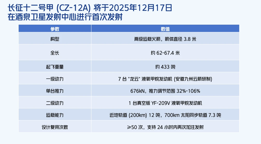 🇨🇳🇨🇳🇨🇳长征十二号甲 (CZ-12A) 将于2025 年 12 月 17 日在酒泉卫星发射中心进行首次发射,并同步尝试一级火箭垂直回收。这是中国航天科技集团八院 (上海航天技术研究院) 研制的新一代可重复使用运载火箭,是长征十二号的可回收版本。