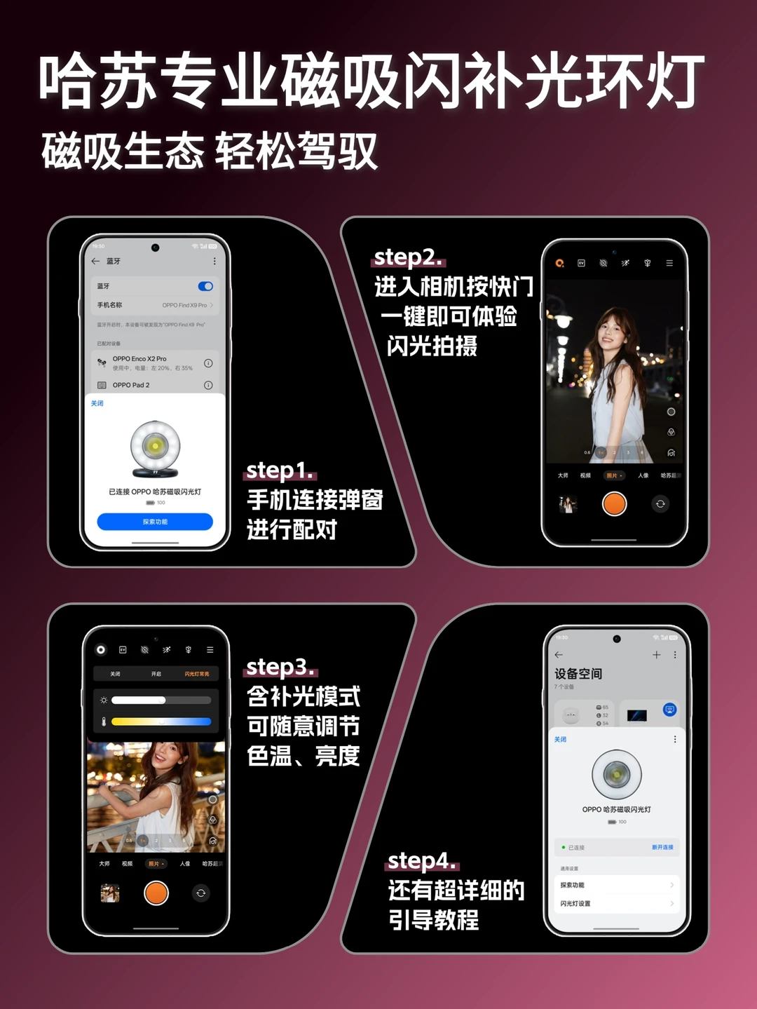 本来以为它已经是“超标”旗舰了,结果没想到它还能给我更大的惊喜!这次我直接解锁了一个让夜景人像原地封神的神仙配件——OPPO哈苏专业磁吸闪补光环灯。