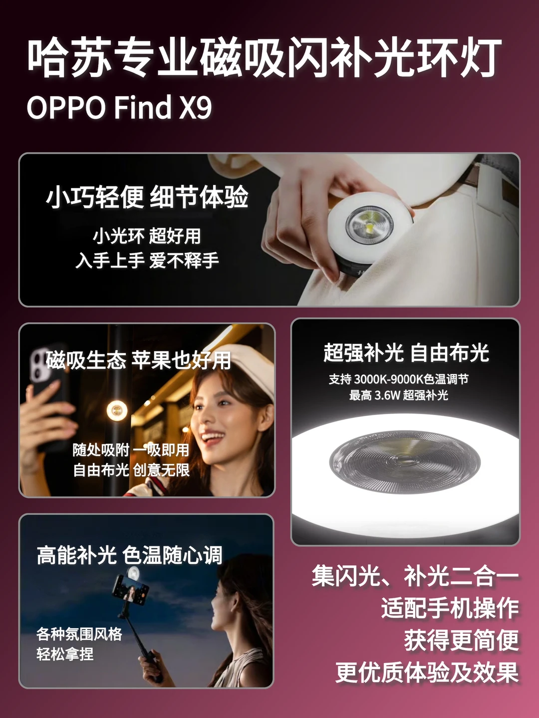 随手一吸,就像打开新世界: 它的体积超小,很精致,揣兜里完全不占地儿!往 Find X9 背后“啪嗒”一吸,瞬间变身专业摄影灯。