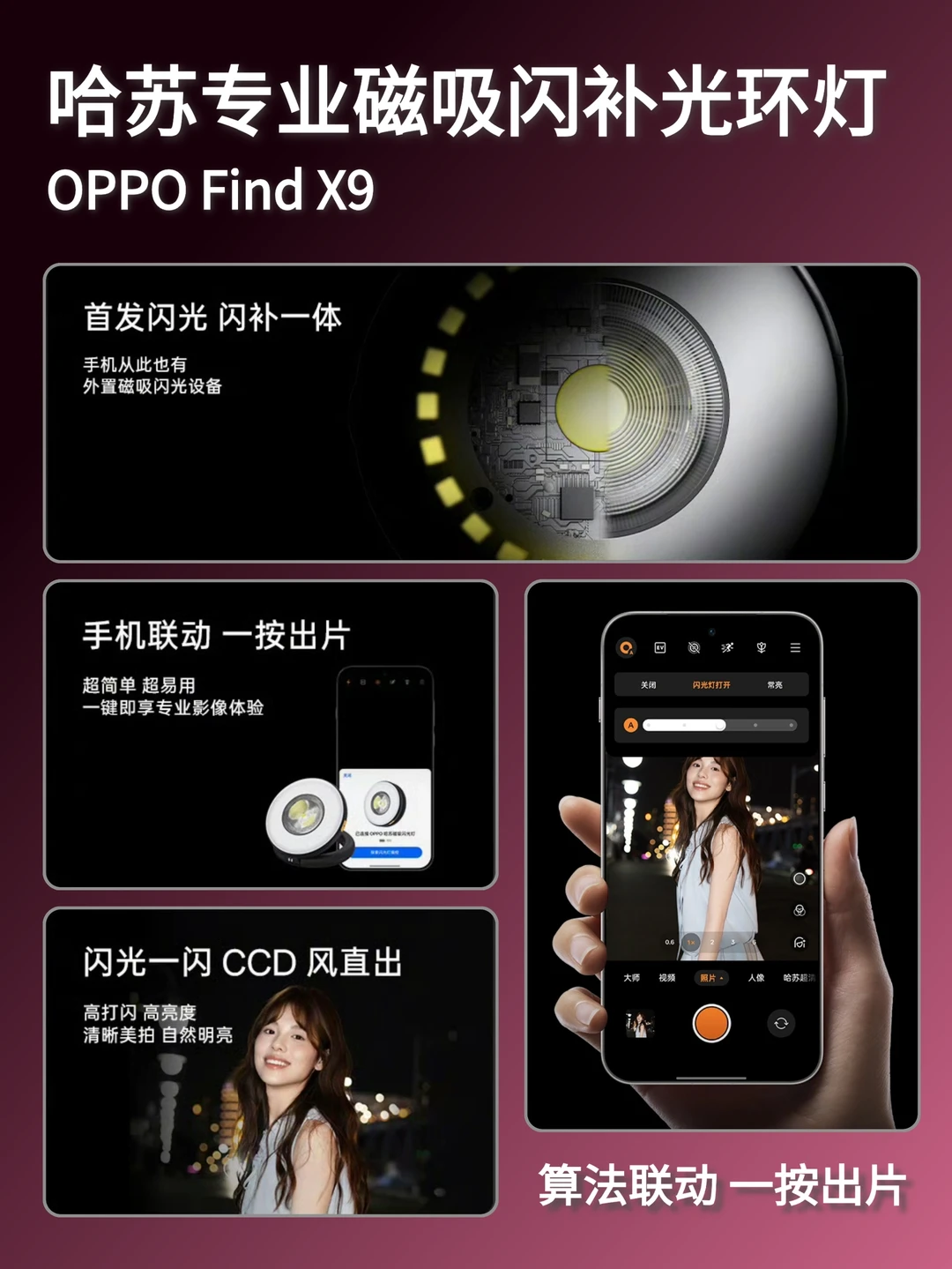 OPPO Find X9内置首发变焦闪光灯,0.6x - 3x 全焦段人像覆盖,「lumo闪光人像算法」「冷调+暖调」两种模式,再加上行业首款手机磁吸闪光灯外设,还原相机「爆闪」质感, CCD闪光人像轻松出片!