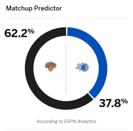 赛前,美媒ESPN预测本场比赛,尼克斯胜率62.2%稍占上风,魔术胜率为37.8%。