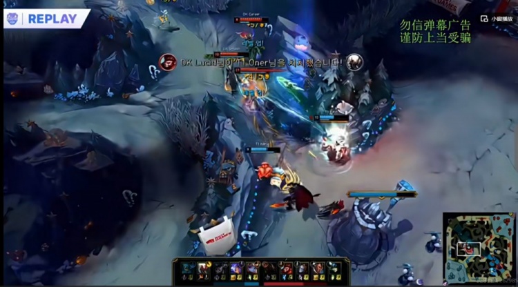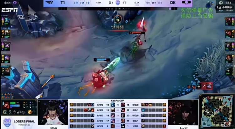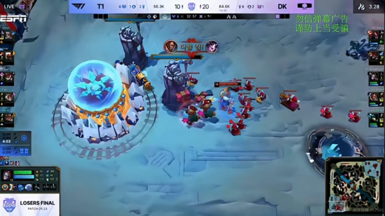 [27:00]下路Keria波比想挡伤害直接被火炮Smash卢锡安两发带走!中路Doran格温强行越塔单杀Siwoo塞恩,拿下一千块,但是自己抗塔也被换掉!DK拆掉T1下路高地!全队对位都是经济领先!