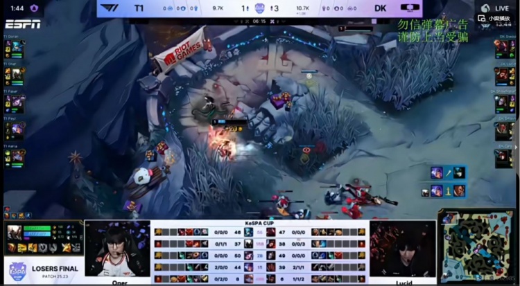 [6:45]上路Keria波比留人想配合打野gank,但是Lucid猴子直接反蹲先行将他击杀,残局Peyz芸阿娜一打三极限拉扯,开了个屏障给自己打出了机会!这波最终Peyz芸阿娜双杀,双方打了个2换2!