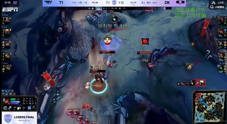 [24:15]Faker辛德拉河道单杀Career娜美之后强行拿下厄塔汗!但是Lucid猴子开转留人,侧翼Siwoo塞恩留住了Peyz芸阿娜!Doran格温还闪现撞墙了!Siwoo塞恩抗塔配合队友完成歼灭!DK团灭T1,顺势拿下大龙+小龙!直接领先快7K经济了!