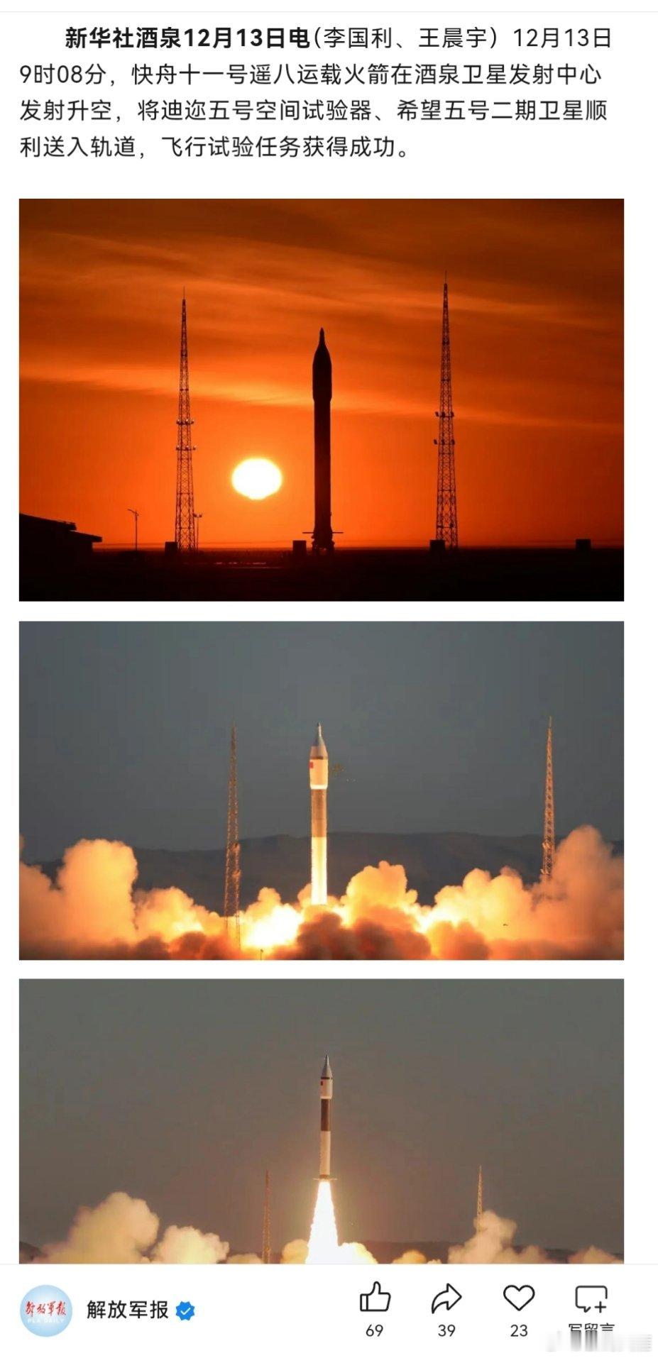 快舟十一号遥八运载火箭发射成功了快舟十一号遥八运载火箭发射成功12月13日9时08分,快舟十一号遥八运载火箭在酒泉卫星发射中心发射升空,将迪迩五号空间试验器、希望五号二期卫星顺利送入轨道,飞行试验任务获得成功。(来源:新华社、“我们的太空”)(解放军报)
