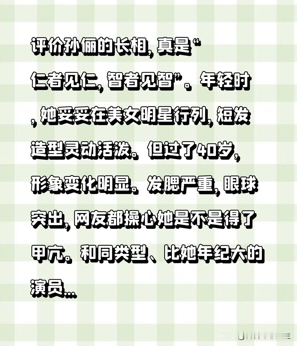 评价孙俪的长相,真是“仁者见仁,智者见智”。年轻时,她妥妥在美女明星行列,短发造型灵动活泼。 但过了40岁,形象变化明显。发腮严重,眼球突出,网友都操心她是不是得了甲亢。和同类型、比她年纪大的演员比,状态下滑明显。殷桃大她3岁,身形如少女;李小冉大她7岁,皮肤依旧白得发光。孙俪本人养生,练瑜伽、初一十五吃素、不喝冷饮,可还是有中年大妈感。她一直留短发,在当下审美里显得有些落后,每次发腮严重还会被吐槽上热搜。现在再用大美人形容她,确实有点难了。 孙俪 孙俪演技派代表 明星 🌹🌹🌹🌹🌹🌹🌹🌹🌹