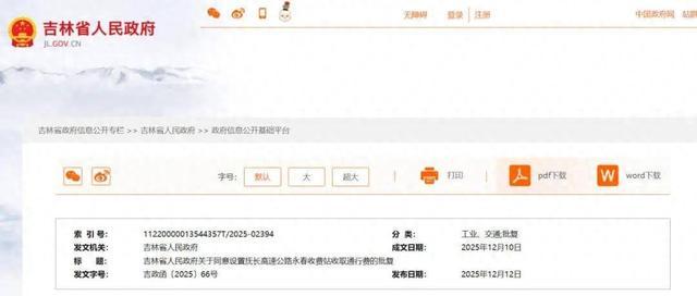 你们《关于设立抚长高速公路永春收费站收取通行费的请示》(吉交联发〔2025〕55号)收悉。经研究,现批复如下: