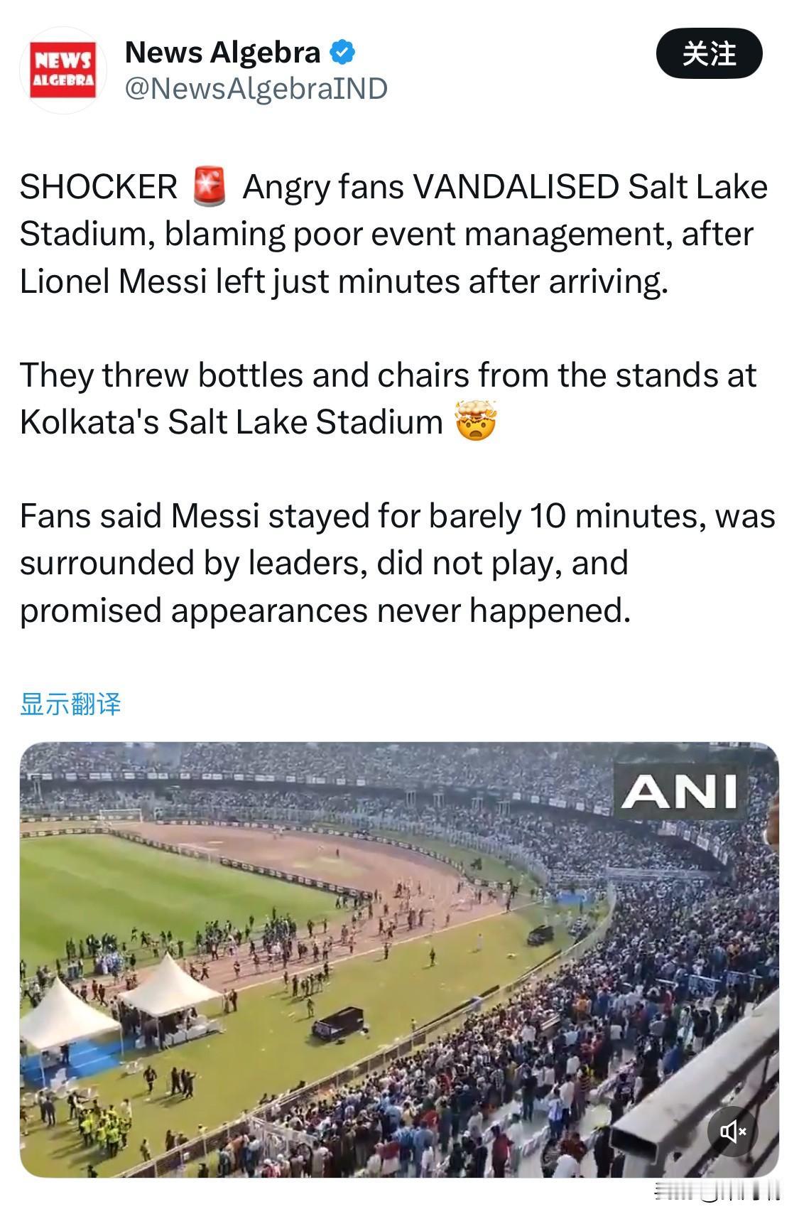 从12月13日到15日,一场名为“GOAT印度巡演2025”的商业与文化盛宴即将上演。在短短三天内,梅西的足迹将横跨印度四大城市——加尔各答、海德拉巴、孟买和新德里。这不仅仅是一次明星访问,更是一场融合了足球、慈善、政治与宝莱坞明星的综合性大秀。不过,梅西在第一天加尔各答的首秀就出了问题,但愿后续活动能够顺利完成。 在加尔各答盐湖体育场(Salt Lake Stadium)举行的梅西“GOAT印度之旅”活动中,球迷因活动管理不善和梅西提前离场而爆发了愤怒情绪,导致体育场遭到破坏。 事件详情 短暂露面:尽管许多球迷支付了高达12,000卢比(约130美元)的昂贵门票,梅西在球场上的时间仅持续了大约10到22分钟。 视线受阻:在场期间,梅西被一群VIP、官员和组织者重重包围,使得看台上的大多数球迷无法清楚地看到他。 球迷反应:由于承诺的互动和表演(包括踢球或射门)没有发生,球迷的沮丧情绪升级,开始高喊口号,并向场内投掷瓶子、椅子和其他物品。 场馆破坏:愤怒的球迷破坏了看台座位、撕毁了横幅,并试图冲破隔离看台和球场的障碍物,导致现场陷入混乱。 官方回应:西孟加拉邦首席部长玛玛塔·班纳吉(Mamata Banerjee)对这一事件表示震惊和不安,并向梅西和球迷道歉,同时下令成立高级别委员会进行调查。活动组织者之一随后被警方拘留。 这场本应是球迷与偶像见面的盛事,最终因组织不力而演变成一场混乱和失望。