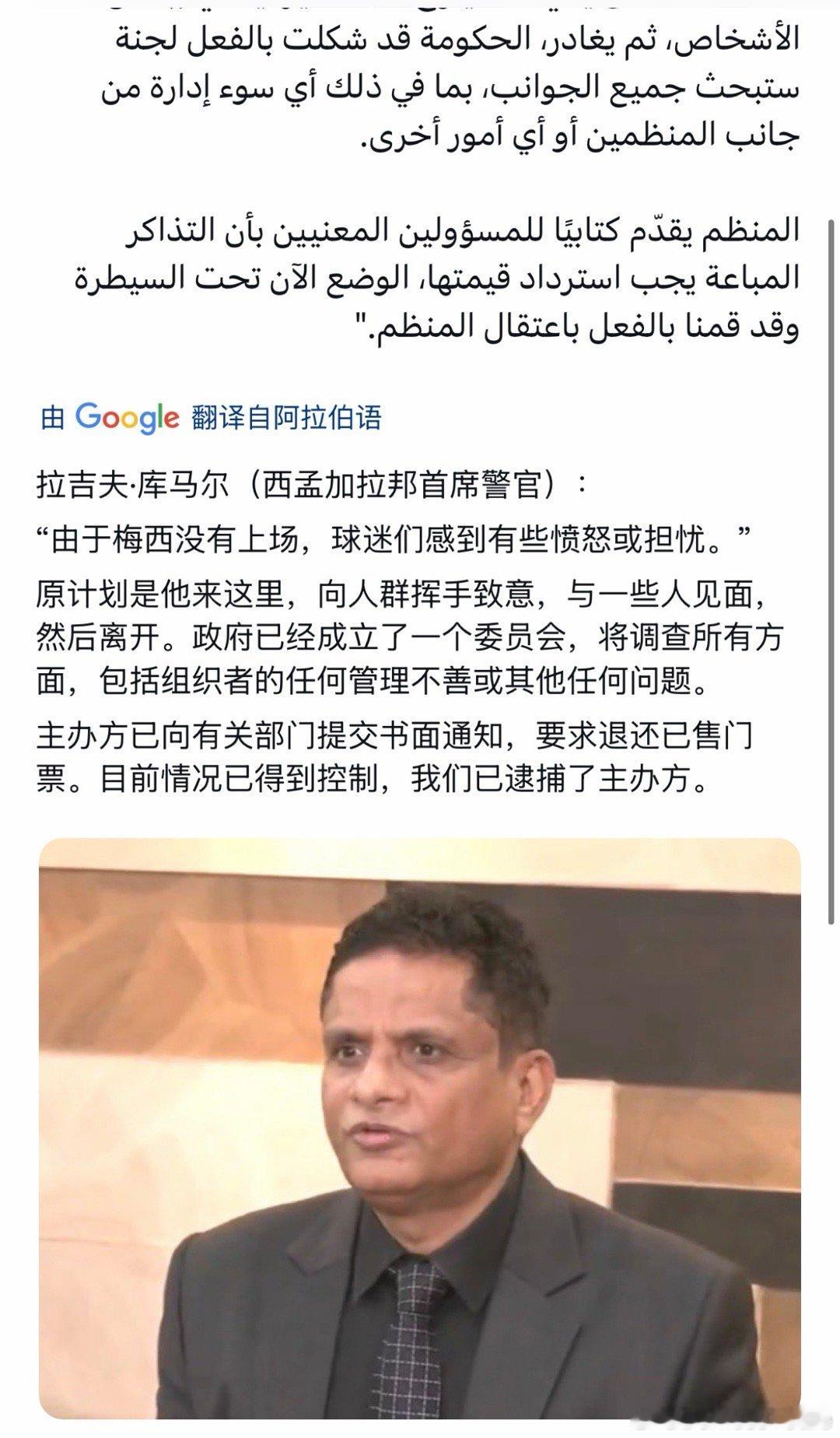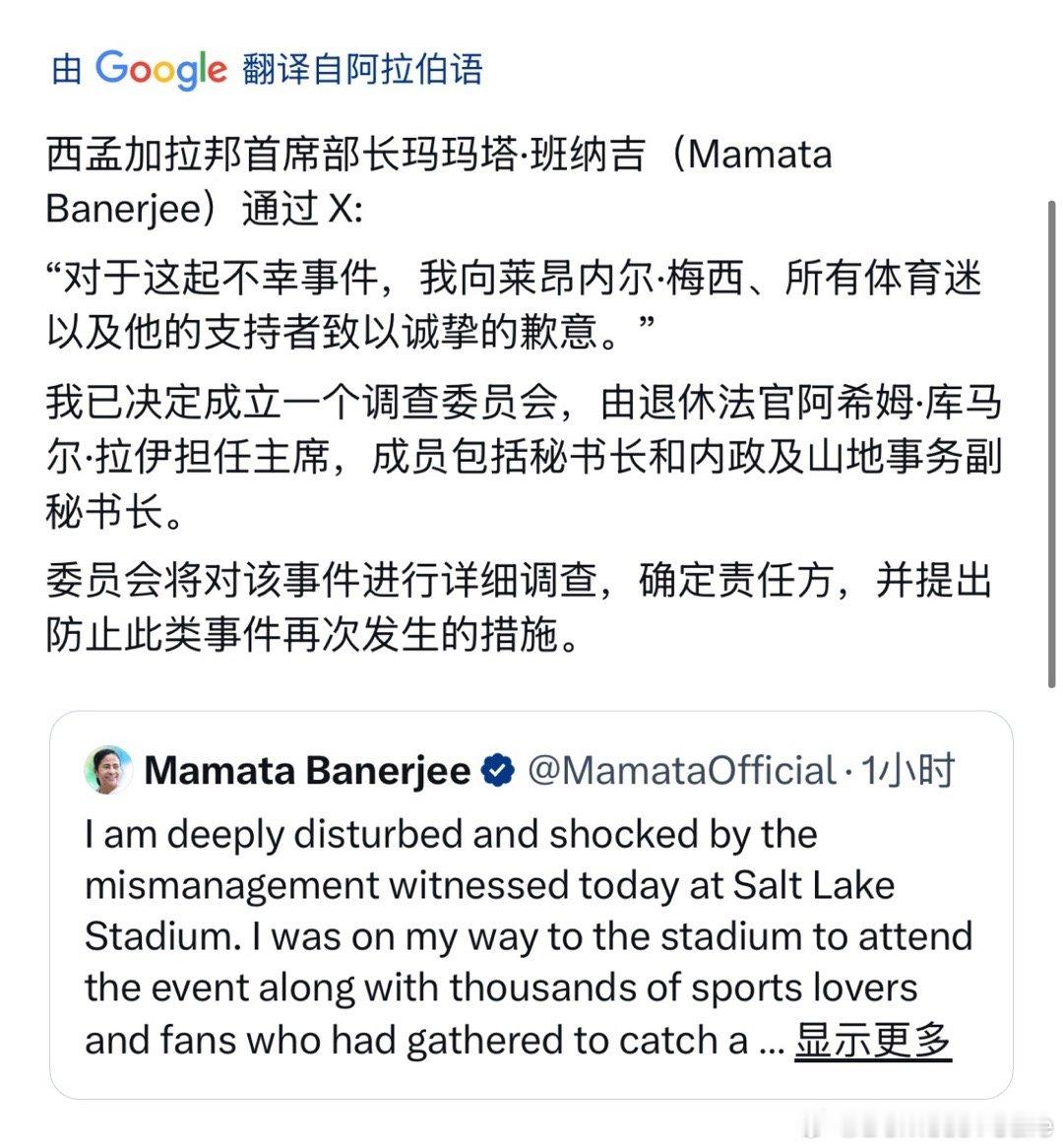 印度方面虽然管理失责,但是出面解决问题的能力比某些只会写小作文甩锅给球员的还是强不少,短短1小时内就有地方政府负责人出面给受到波及的梅西以及球迷道歉,并成立调查委员会厘清事情始末,同时组织方被追责,组织者已经被拘留控制,并要求给球迷退票。 梅西印度行