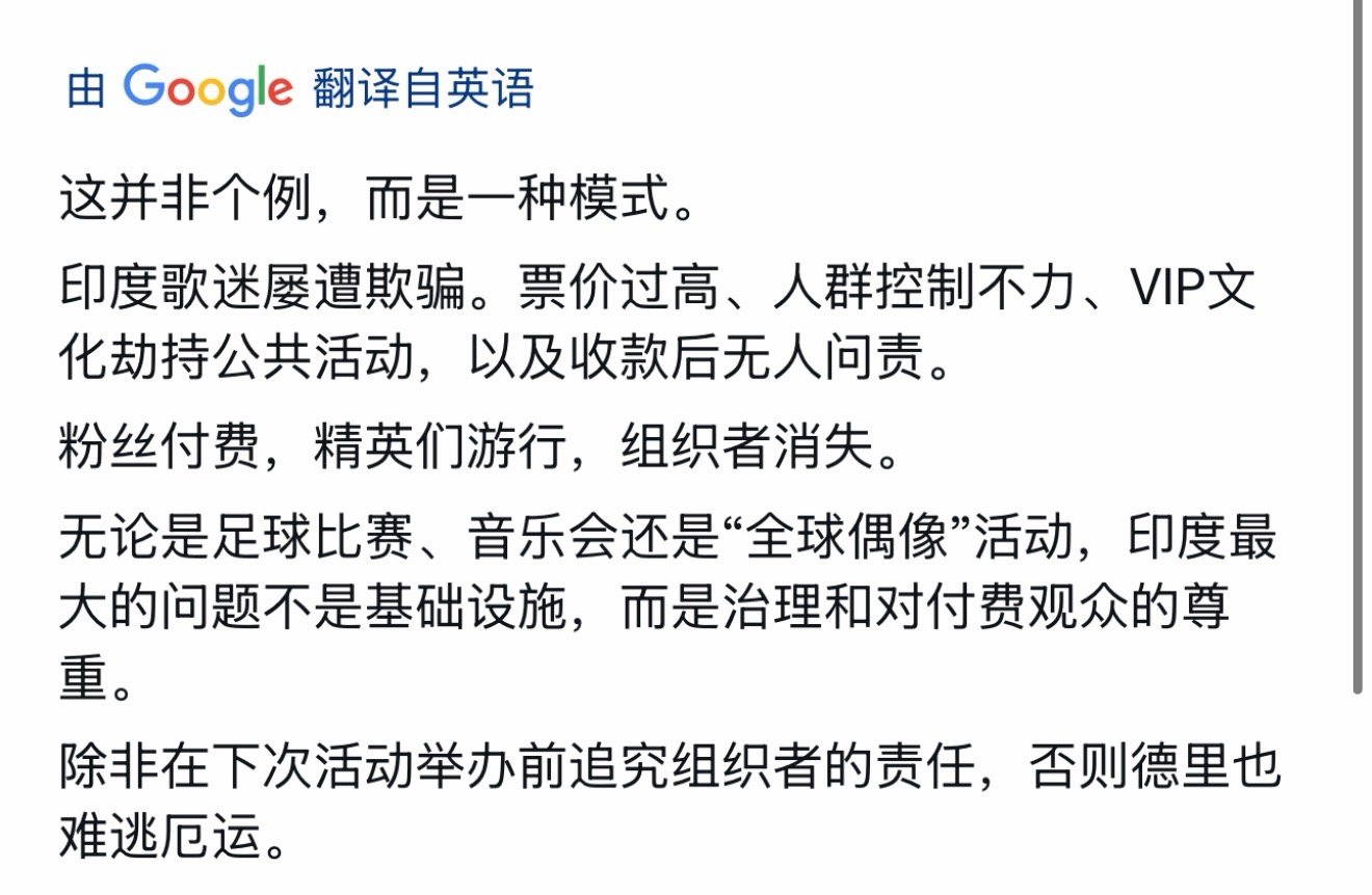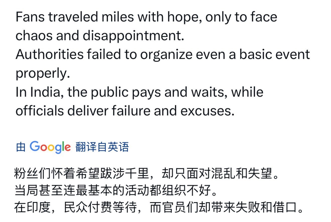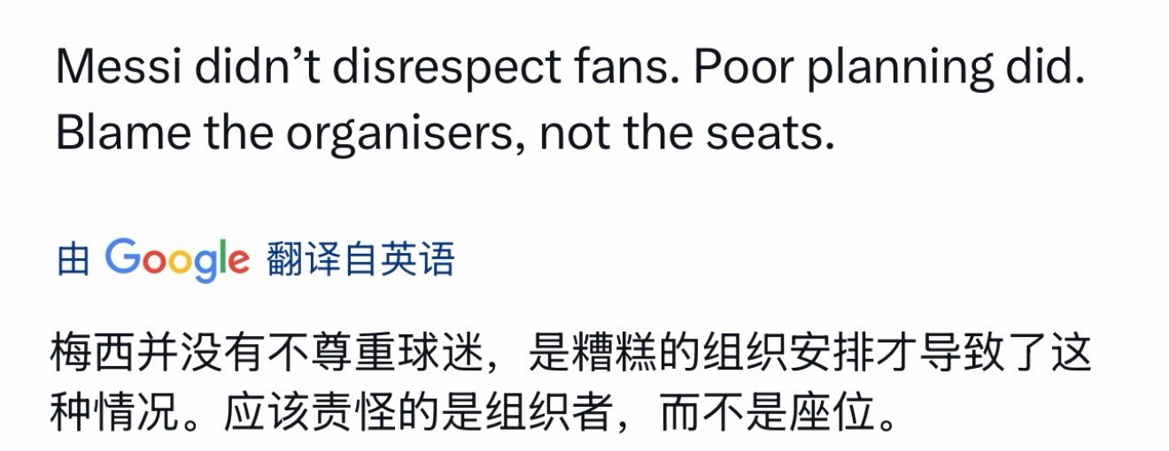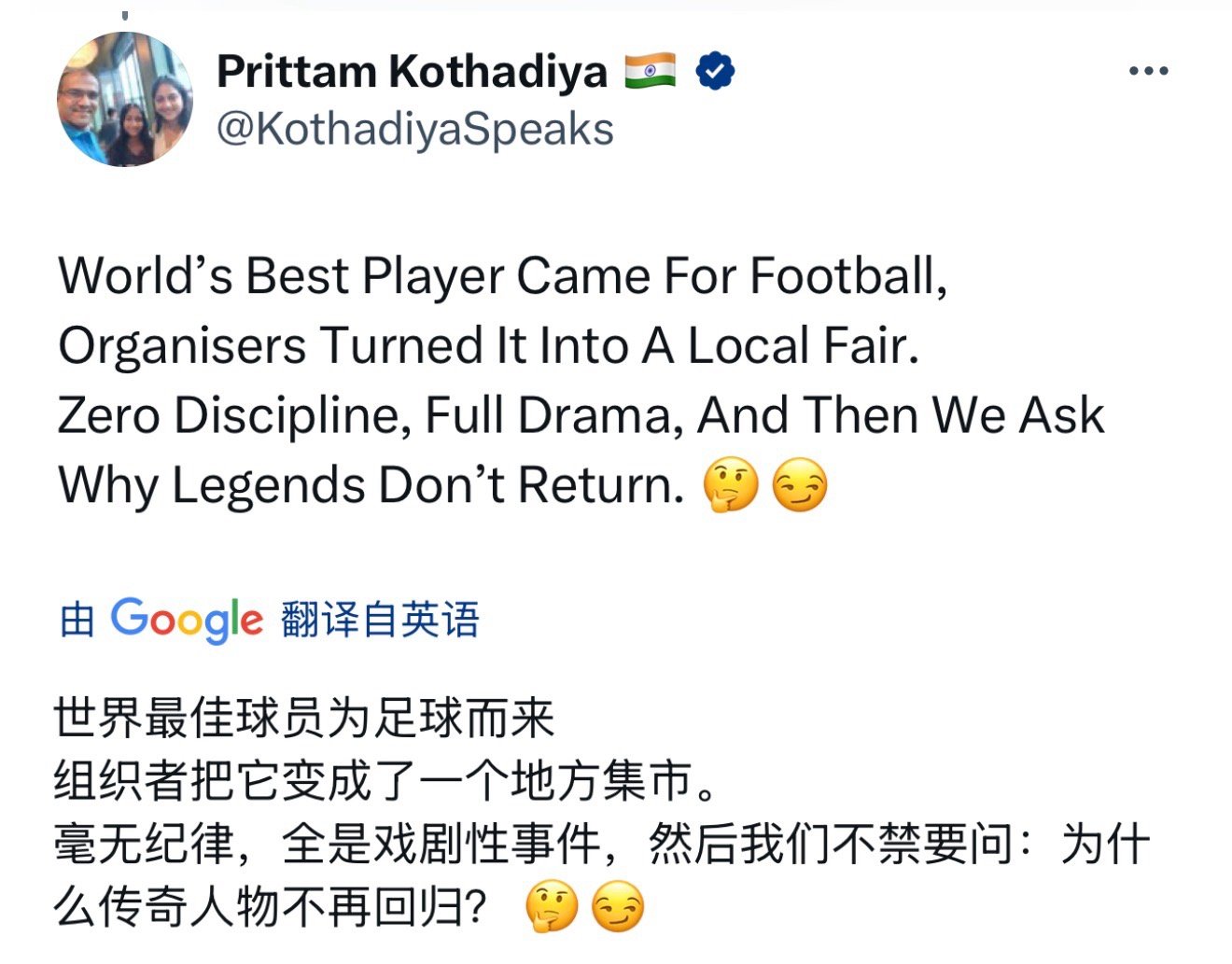 梅西印度行 看了外网印度媒体报道梅西印度行活动的评论区,当地球迷相当一致且理智:几乎无人迁怒梅西,大家清醒地将混乱根源指向主办方的组织失职、失控的VIP特权文化,进而讨论更深层的公共治理难题以及此事折射的国家形象困境。愤怒却没失焦,这何尝不是另一种对比