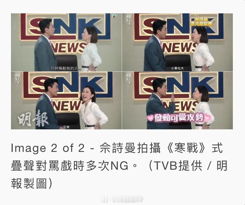 【明報即時】新聞女王²|周一兩小時大結局 佘詩曼演疊聲對罵戲狂NG 《新聞女王²》最後兩集,文慧心全力對付Kingston。(TVB提供)無綫台慶劇《新聞女王²》將於下周一(15日)晚上八點半在翡翠台連播兩小時大結局。昨晚(12日)劇情講述Diana(蔣祖曼飾)最終同意回收「治癌神器」,方太(龔慈恩飾)蘇醒並推薦文慧心(佘詩曼飾)出任SNK董事局主席。文慧心掌權後,宣布計劃將SNK私有化,並全力整治電視部總監兼宿敵Kingston(黃宗澤飾)。該集亦是Kingston與文慧心正面交鋒最多的一集,黃宗澤與佘詩曼以精湛演技展現張力。劇組特別安排一場《寒戰》式疊聲對罵戲,雖僅8秒,卻台詞繁複,令佘詩曼連續3次輸給黃宗澤,更一度忘詞。佘詩曼出錯時除了嘟嘴,更伸脷及激動大聲吼叫,令黃宗澤失守爆笑及扮掌摑她。黃宗澤早前接受娛樂訪談節目《一周星星》訪問時透露,該場戲是佘詩曼「最討厭的一場」。佘詩曼亦直言:「最慘係佢(Bosco)把聲又大,我把聲又細,我完全聽唔到自己講嘢。你聽唔聽到自己講嘢?」黃宗澤笑言:「其實我都唔係好聽得到!」佘詩曼續說:「我好似得番口形咁,我只係覺得好笑,我哋試嗰時係咁笑。」2人同聲表示完成拍攝後感覺暢快,黃宗澤更形容:「好過癮,因為你好似要處於一個好真空嘅狀態,背到好熟,滾瓜爛熟,行埋去就互隊,真係好難。」另一焦點劇情則圍繞家妍(李施嬅飾)與劉艷(王敏奕飾)分別追查網上情騙案及大學生虧空公款案,最終線索指向跨國詐騙據點「3U園」。飛爺(鄧智堅飾)與家妍為保障同事安全拒絕深入調查,但SNK的Ivan(何廣沛飾)堅持潛入「3U園」進行調查報道,Man姐極力阻止不果,決定讓他前往。(即時娛樂)