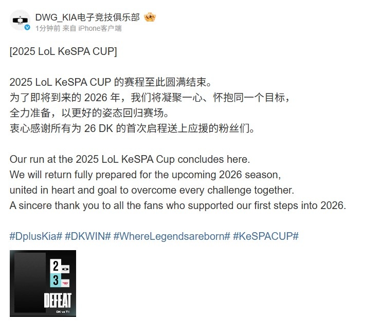 被让二追三结束DK官方:衷心感谢为26DK首次启程应援的粉丝们
