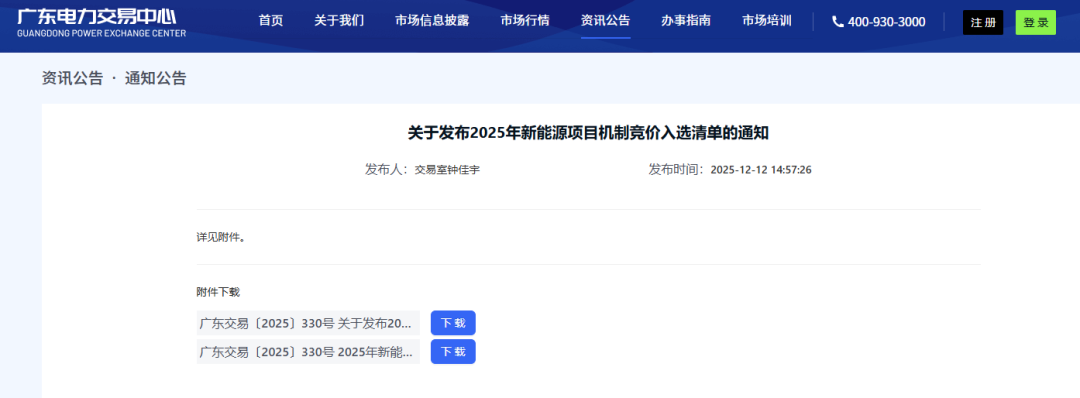 12月12日,广东电力交易中心发布2025年新能源项目机制竞价入选清单。