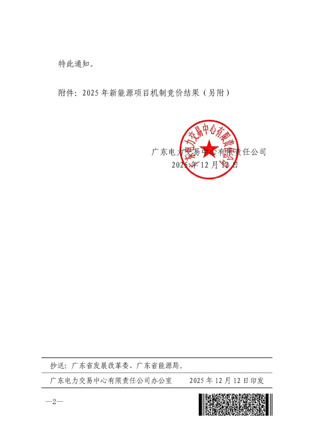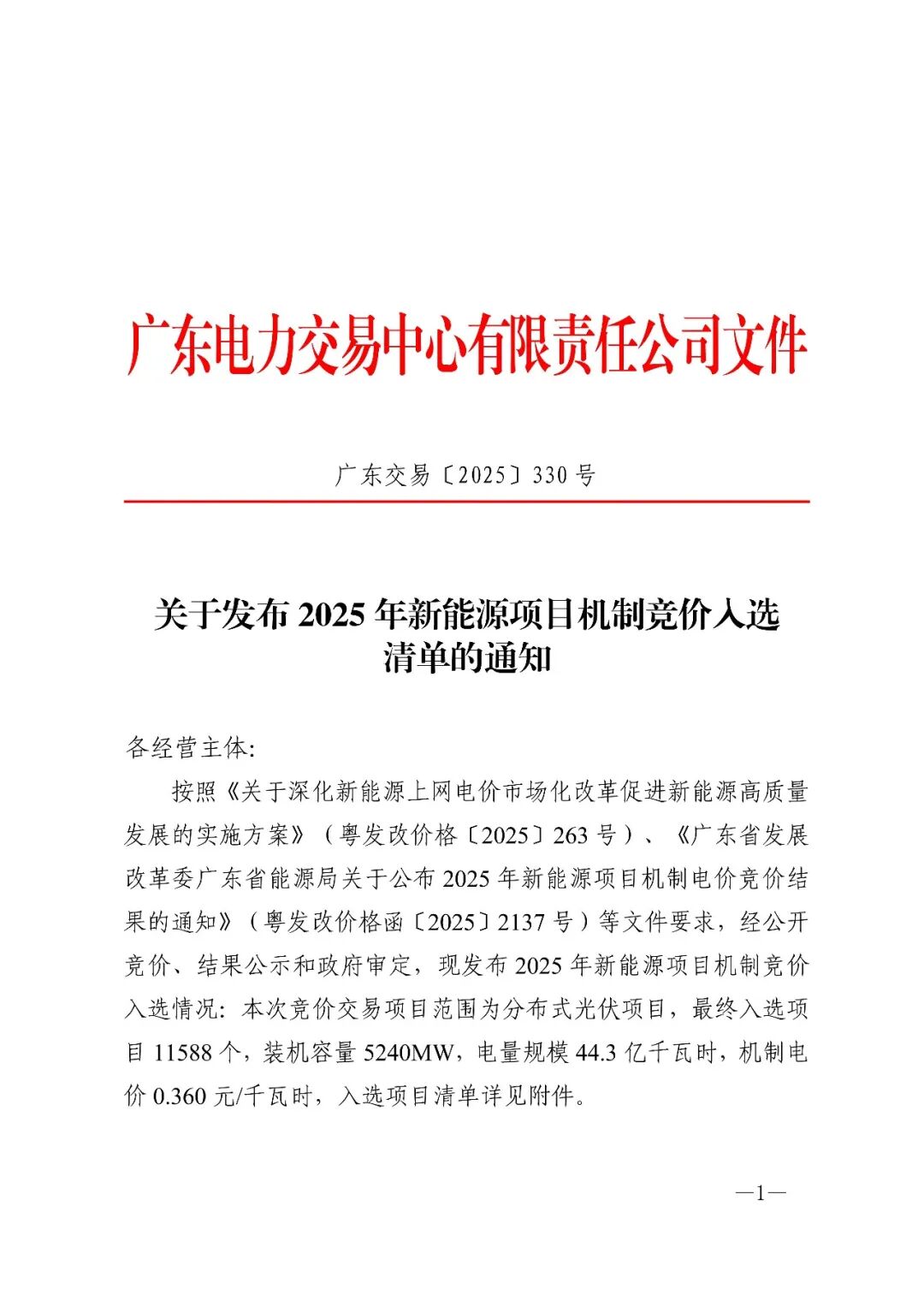 10月30日,广东电力交易中心公布《关于2025年新能源项目机制电价竞价结果公示的通知》。