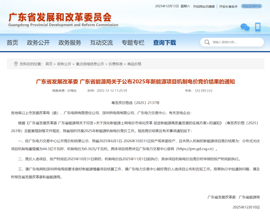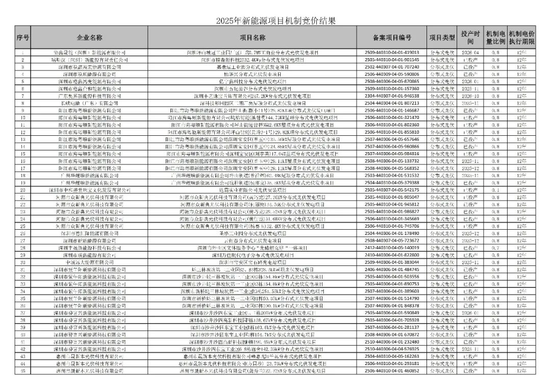 光伏头条获悉,12月12日,广东省发展改革委、广东省能源局发布关于公布2025年新能源项目机制电价竞价结果的通知。