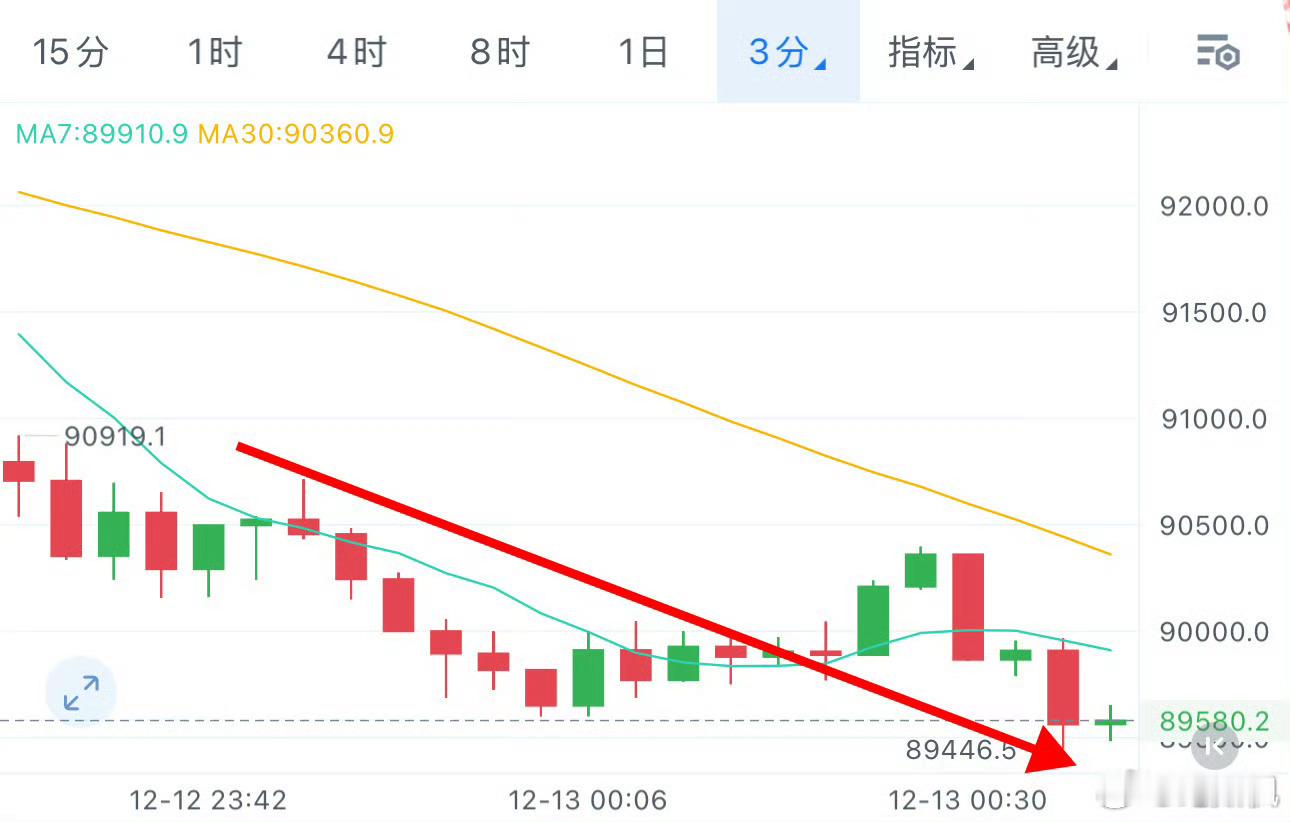 昨晚及时调整方向!!!90700一线直接追空,跌到89500,狙击1200点。