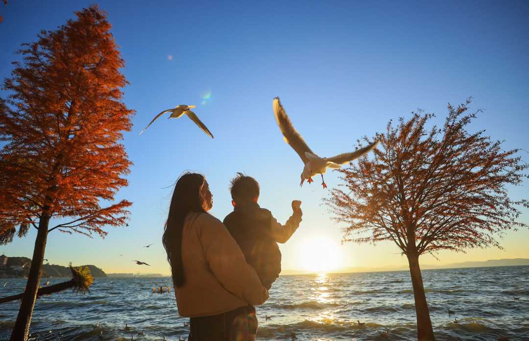 12月12日,云南省昆明市捞鱼河湿地公园,游客在投喂翩跹飞舞的红嘴鸥。